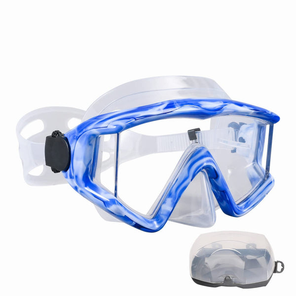 Snorkel mask: The better diving and swimming experience starts with a high-quality mask While diving or swimming, what could be more frustrating than wearing a mask that leaks or fogs a lot AQUA A DIVE mask USES food-grade silicone that provides A strong and comfortable seal Highlights: 1The flexible silicone belt is leakproof and comfortable and sealed: This soft, soft silicone fits all the contours of your face More customized fit, with a waterproof leak proof seal No leaks, no trouble Plus, silicone feels good, doesnt smell bad, and youll forget its even there 2One-Piece Lens: The one-piece lens allows for a smoother view forward and gives a more open, roomy feel to better enjoy the underwater world,as well as a better view of the surroundings to spot potential dangers 3Polycarbonate lens: Polycarbonate lenses have good fall resistance, avoiding the breakage caused by careless fall, and better protecting the eyes 4convenient Buckle for easy Adjustment With its simple to use design,the buckle adjusts easily for a customized fit Want to know the different ways you can use this product go swimming in the shallow waters right off the beach Dive off of a boat to explore reefs Swimming in a pool,our snorkel goggles are great for people of all experience levels, and that includes beginners What you will get 1 * Diving goggles 1 * scuba mask box