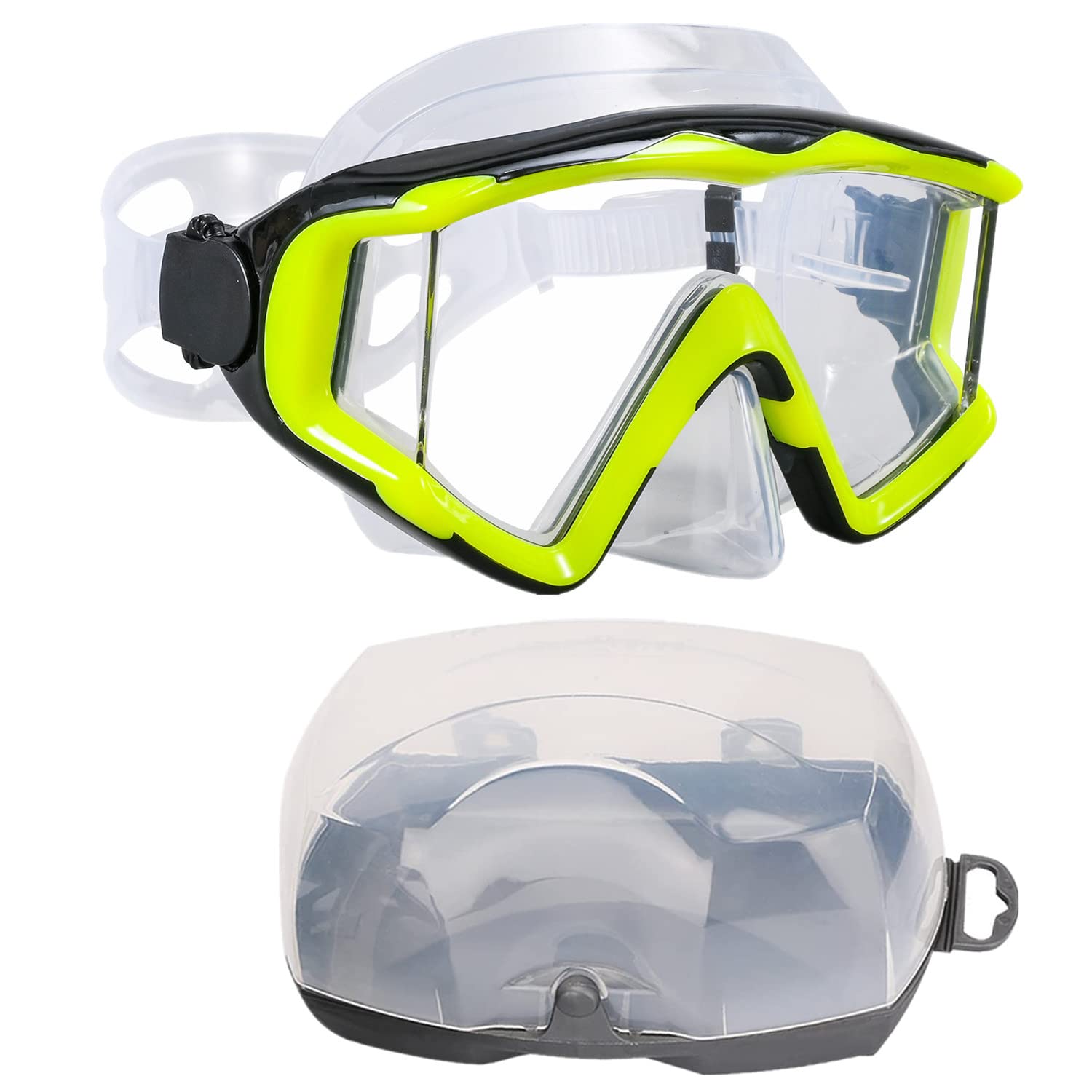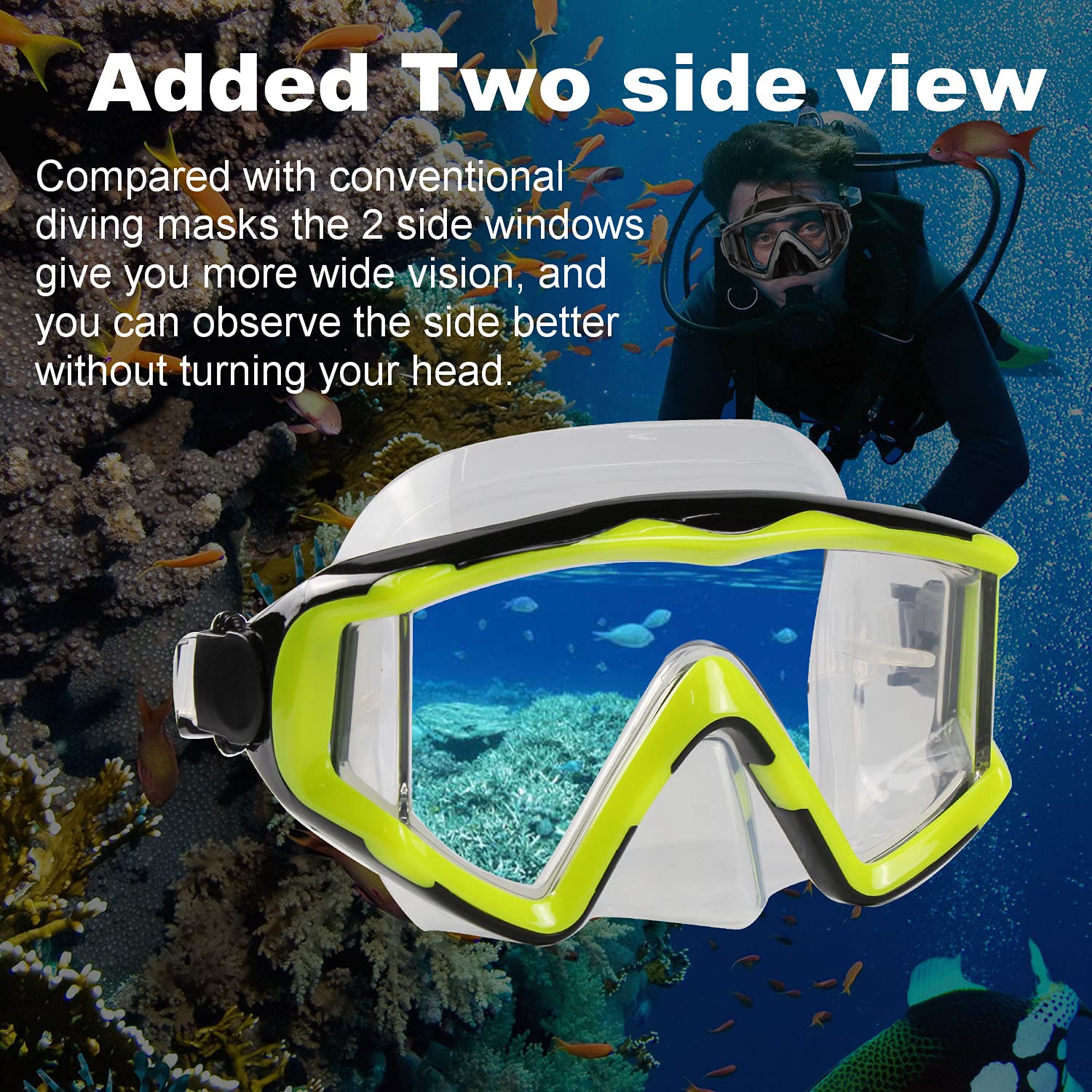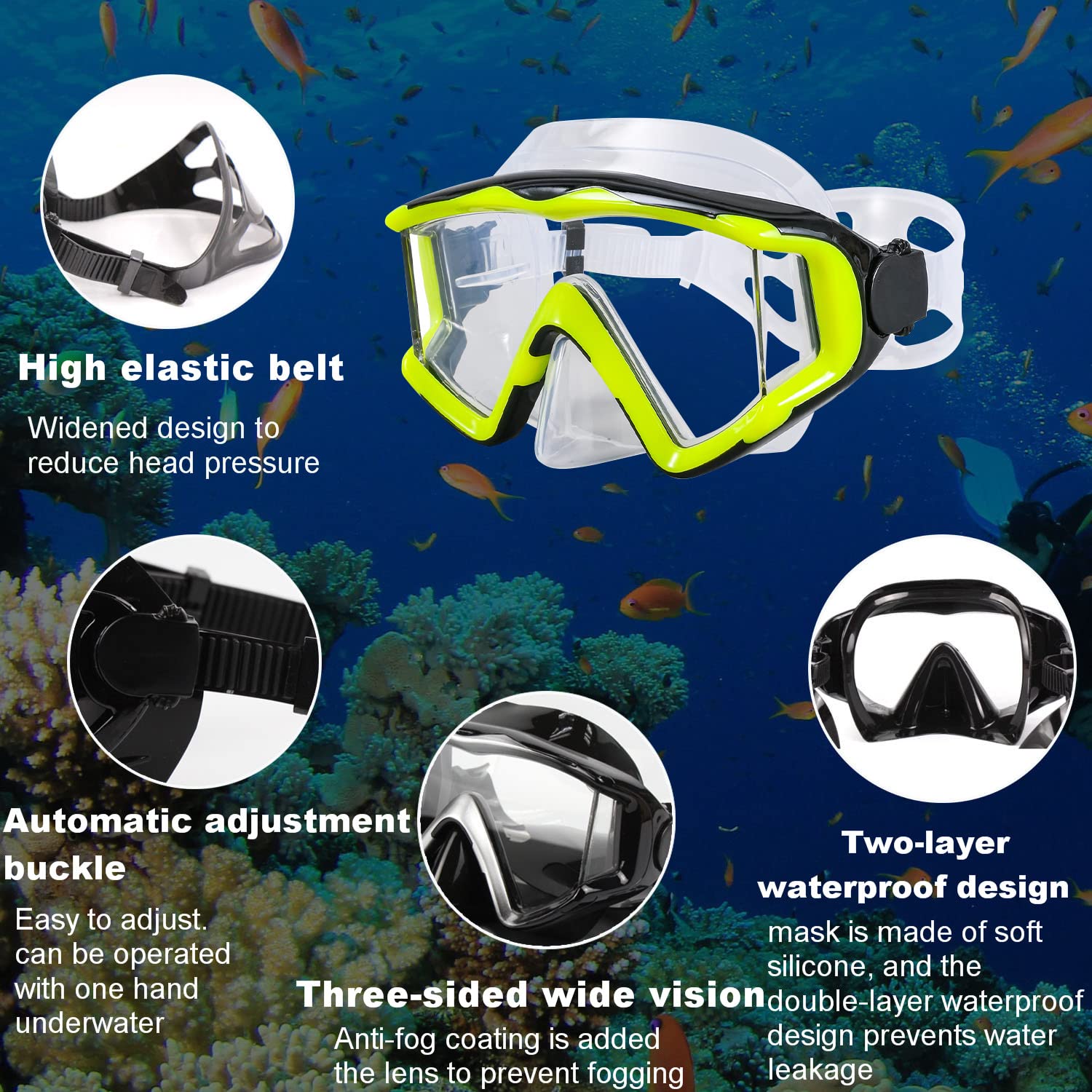 Snorkel mask: The better diving and swimming experience starts with a high-quality mask While diving or swimming, what could be more frustrating than wearing a mask that leaks or fogs a lot AQUA A DIVE mask USES food-grade silicone that provides A strong and comfortable seal Highlights: 1The flexible silicone belt is leakproof and comfortable and sealed: This soft, soft silicone fits all the contours of your face More customized fit, with a waterproof leak proof seal No leaks, no trouble Plus, silicone feels good, doesnt smell bad, and youll forget its even there 2One-Piece Lens: The one-piece lens allows for a smoother view forward and gives a more open, roomy feel to better enjoy the underwater world,as well as a better view of the surroundings to spot potential dangers 3Polycarbonate lens: Polycarbonate lenses have good fall resistance, avoiding the breakage caused by careless fall, and better protecting the eyes 4convenient Buckle for easy Adjustment With its simple to use design,the buckle adjusts easily for a customized fit Want to know the different ways you can use this product go swimming in the shallow waters right off the beach Dive off of a boat to explore reefs Swimming in a pool,our snorkel goggles are great for people of all experience levels, and that includes beginners What you will get 1 * Diving goggles 1 * scuba mask box