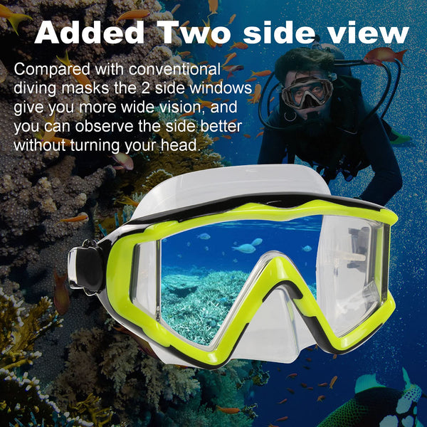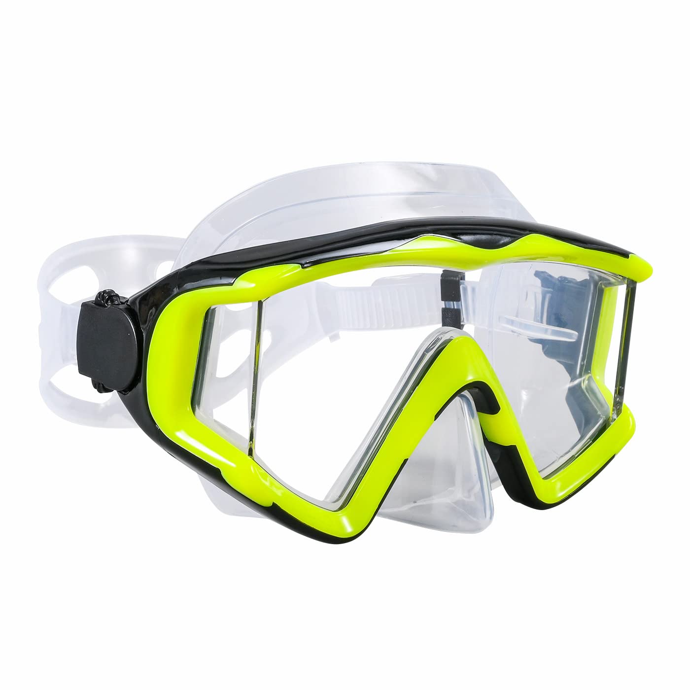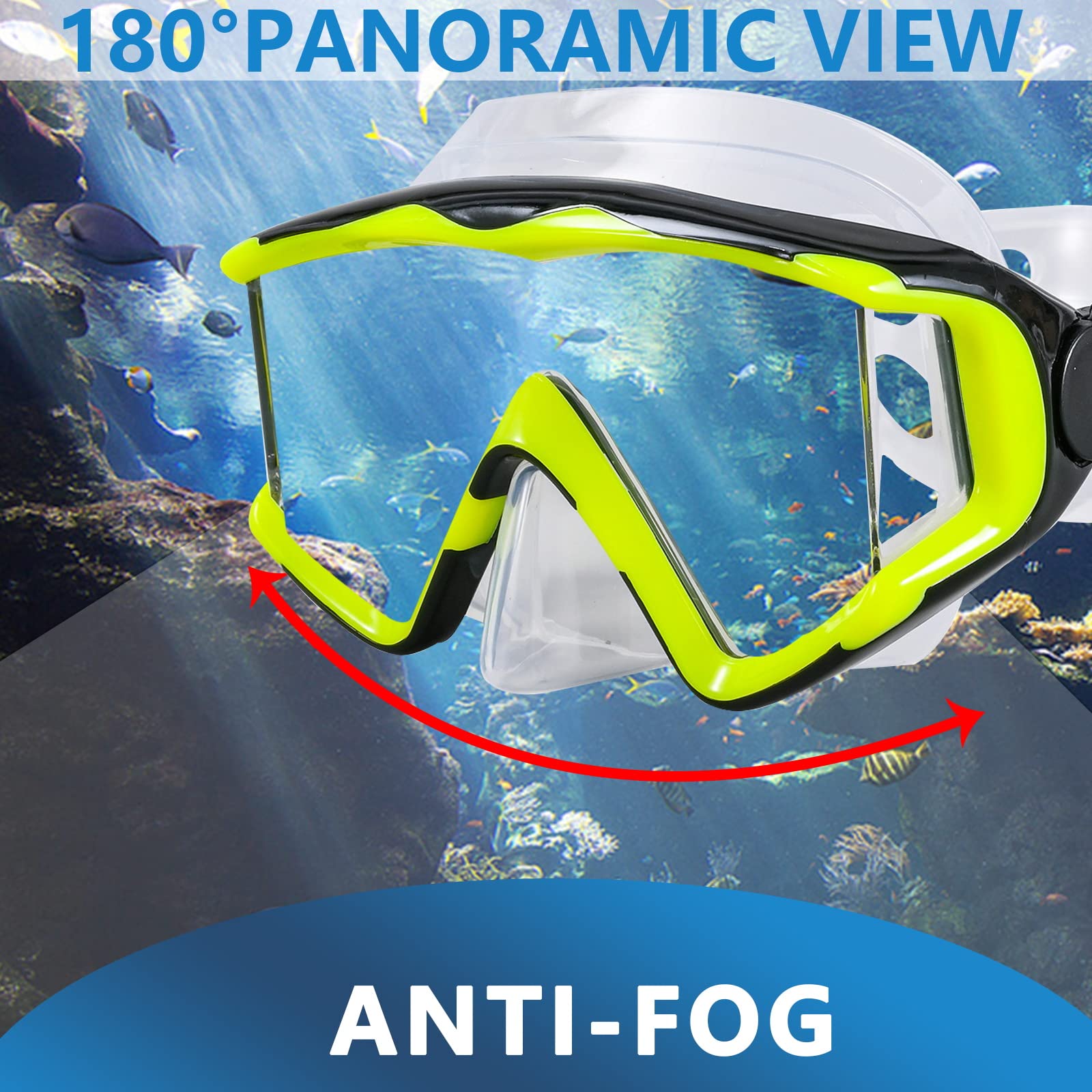 Snorkel mask: The better diving and swimming experience starts with a high-quality mask While diving or swimming, what could be more frustrating than wearing a mask that leaks or fogs a lot AQUA A DIVE mask USES food-grade silicone that provides A strong and comfortable seal Highlights: 1The flexible silicone belt is leakproof and comfortable and sealed: This soft, soft silicone fits all the contours of your face More customized fit, with a waterproof leak proof seal No leaks, no trouble Plus, silicone feels good, doesnt smell bad, and youll forget its even there 2One-Piece Lens: The one-piece lens allows for a smoother view forward and gives a more open, roomy feel to better enjoy the underwater world,as well as a better view of the surroundings to spot potential dangers 3Polycarbonate lens: Polycarbonate lenses have good fall resistance, avoiding the breakage caused by careless fall, and better protecting the eyes 4convenient Buckle for easy Adjustment With its simple to use design,the buckle adjusts easily for a customized fit Want to know the different ways you can use this product go swimming in the shallow waters right off the beach Dive off of a boat to explore reefs Swimming in a pool,our snorkel goggles are great for people of all experience levels, and that includes beginners What you will get 1 * Diving goggles 1 * scuba mask box