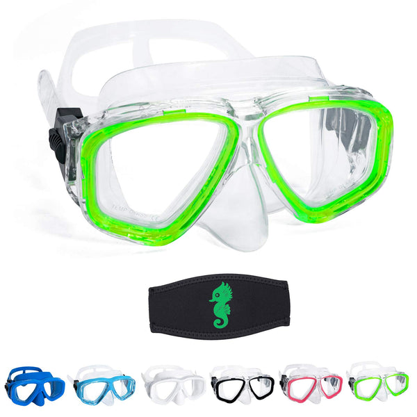 Premium Scuba Diving Swimming Snorkeling Mask Our silicone is soft, comfortable and perfect for your next underwater expedition The OMgear Kids swim mask comes with a 90-Day refund guarantee and a one year manufacturers warrantyBest quality materials Our swimming goggles are made by highly durable materials food grade silicone strap and skirt, tempered glass lens ,softy neoprene strap cover, providing extremely comfortable performanceFeatures Diving mask ( Pc frame) - water-tight ,100% leak-free - Tempered glass Lens, durable and safety even when deep diving - Easy-Adjustable side buckles and silicone strap (one size fits all ) -180APanoramic wide view, providing perfect underwater adventure-Enhanced comfort (silicone strap and skirt, neoprene band) Important advice -Do not jump into water while wearing this -When initial use, you can rub toothpaste on the inside of both lens with your finger for around 5 minutes, then wash with water This will be helpful for preventing lenses fogging After using every time, washing with fresh water can prolong life of