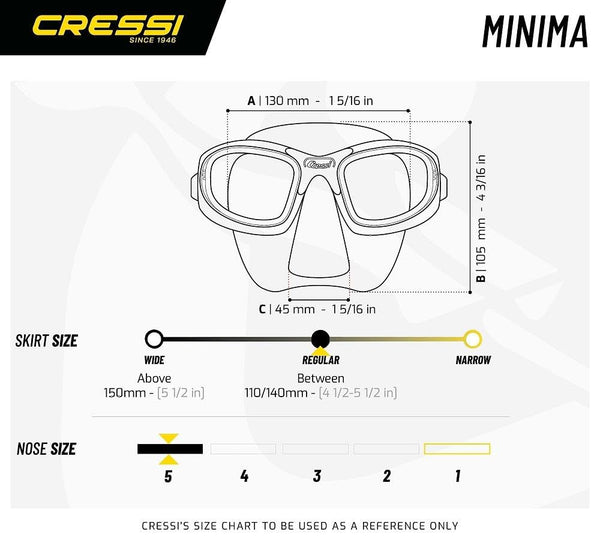 A mask expressly conceived for deep apnea with innovative features that put it at the top of its category The special silicone facial, very enveloping and equipped with a minimum skirt, adheres especially well to the face, reducing dead spaces inside the mask to a minimum The internal volume is therefore very small and favors an extremely easy compensation reducing the air consumption during the descent The glass eye distance is the absolute smallest on the market and guarantees, even with its small surface glass, a correct viewing angle in all directions The two lenses are made of tempered glass with a thickness greater than the standard to allow special safety The buckles are instantaneously adjustable for easy and precise tensioning The flat lenses together with the special rigidity of the central bridge guarantee always a perfect quality of vision underwater without the usual distortions in this type of mask Ideal use: apnea, snorkeling, and replacement mask for technical diving Internal volume: 95 cmA 58 cu in Frame dimensions: 168 x 45 mm 66 x 18 in Weight (with strap included): 118 g 42 oz The Minima is designed and manufactured in Italy by cressi, an Italian brand pioneer in freediving, spearfishing, and scuba diving equipment since 1946 The product is covered by a 2-year limited warranty