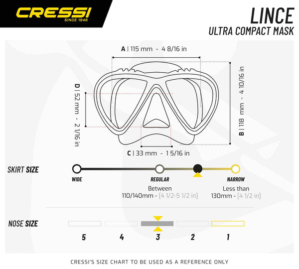 For all intents and purposes, the Cressi Lince can be considered the little brother of the Cressi Matrix, due to its volumes and dimensions. The Lince is a descendant of the legendary Big Eyes, from which it takes all its exceptional characteristics in terms of visibility, with a skirt that has been designed for narrow faces, ideal for women and children. It has a very low internal volume, even lower than that of the specific free diving models, and can be used with great satisfaction even by enthusiasts of the most demanding free dive descents. Its extraordinary visibility, together with extreme comfort and a modern and efficient system for adjusting the strap makes this model indispensable for all diving activities, from snorkeling to deep free diving, to scuba diving.The Lince is designed and manufactured in Italy by Cressi, an Italian brand pioneer in scuba diving,snorkeling and swimming equipment since 1946.