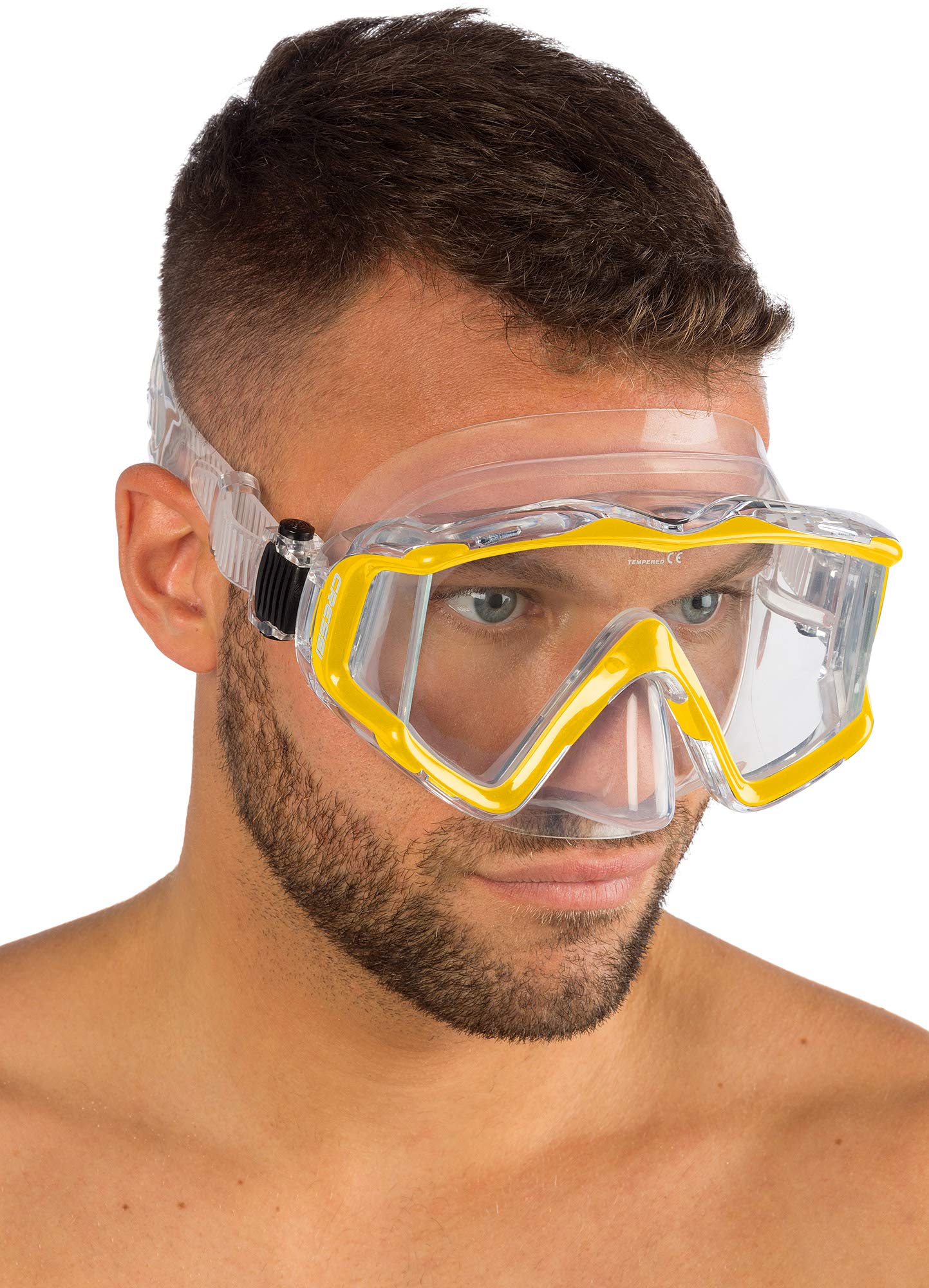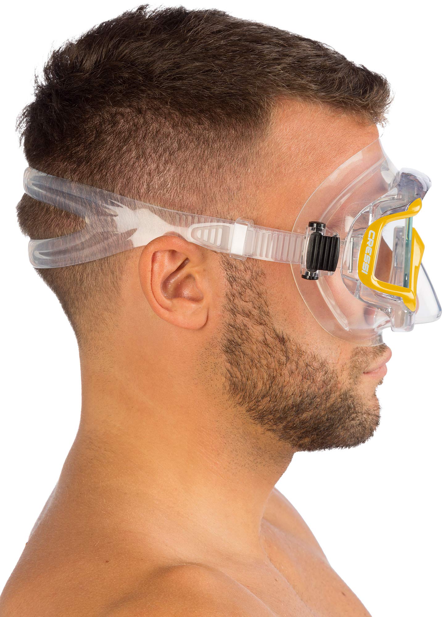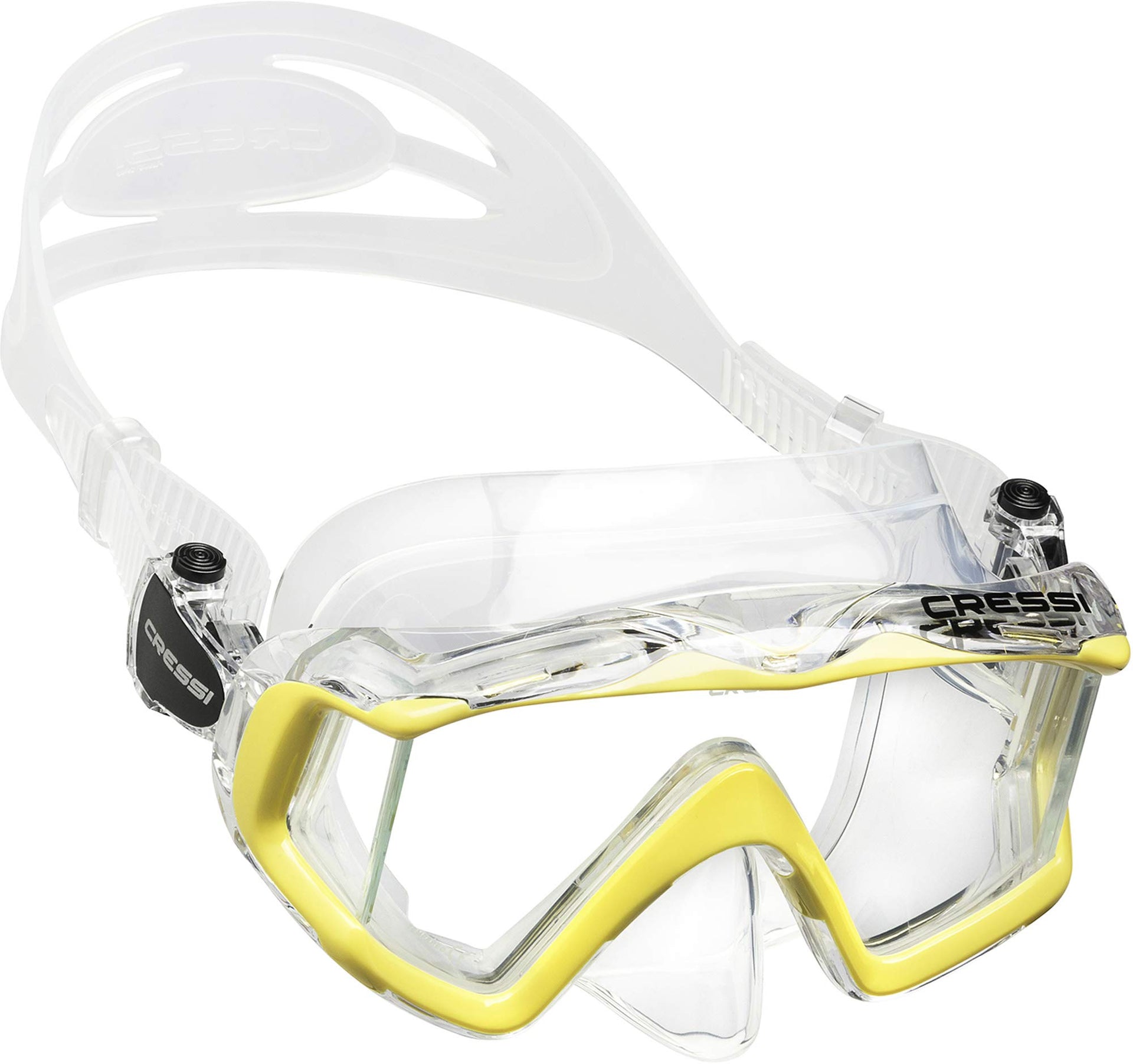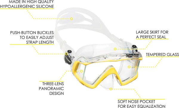 The side lenses of the Pano 3 are precisely fit to the main lens for a nearly uninterrupted field of view. The result is a mask that allows maximum light and feels as open as the ocean itself. Quick-adjust mask strap buckles provide a secure fit and are easy to use, even while wearing gloves, and a high quality silicone skirt provides an excellent seal for most faces. The Pano 3 is designed in Italy by Cressi and made in Taiwan. Cressi has been an Italian brand pioneer in scuba diving, snorkeling, and swimming equipment since 1946. The product is covered by a 2-year limited warranty.
