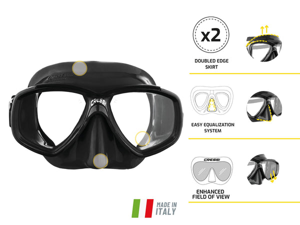 The cressi Perla is a mask particularly suitable for Free Diving and Snorkeling, but just as appropriate for use in Scuba Diving It has Separate Lenses, a skirt edge tting most of the faces and a small inner volume, perfect for Free-divers It is made from soft transparent or dark Silicone for a better comfort and perfect seal It comes with strong rapid action buckles to adjust the length strap