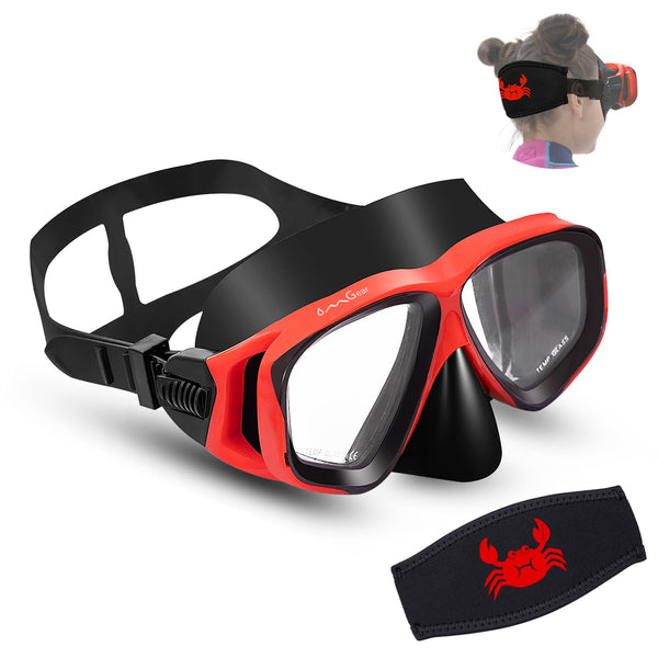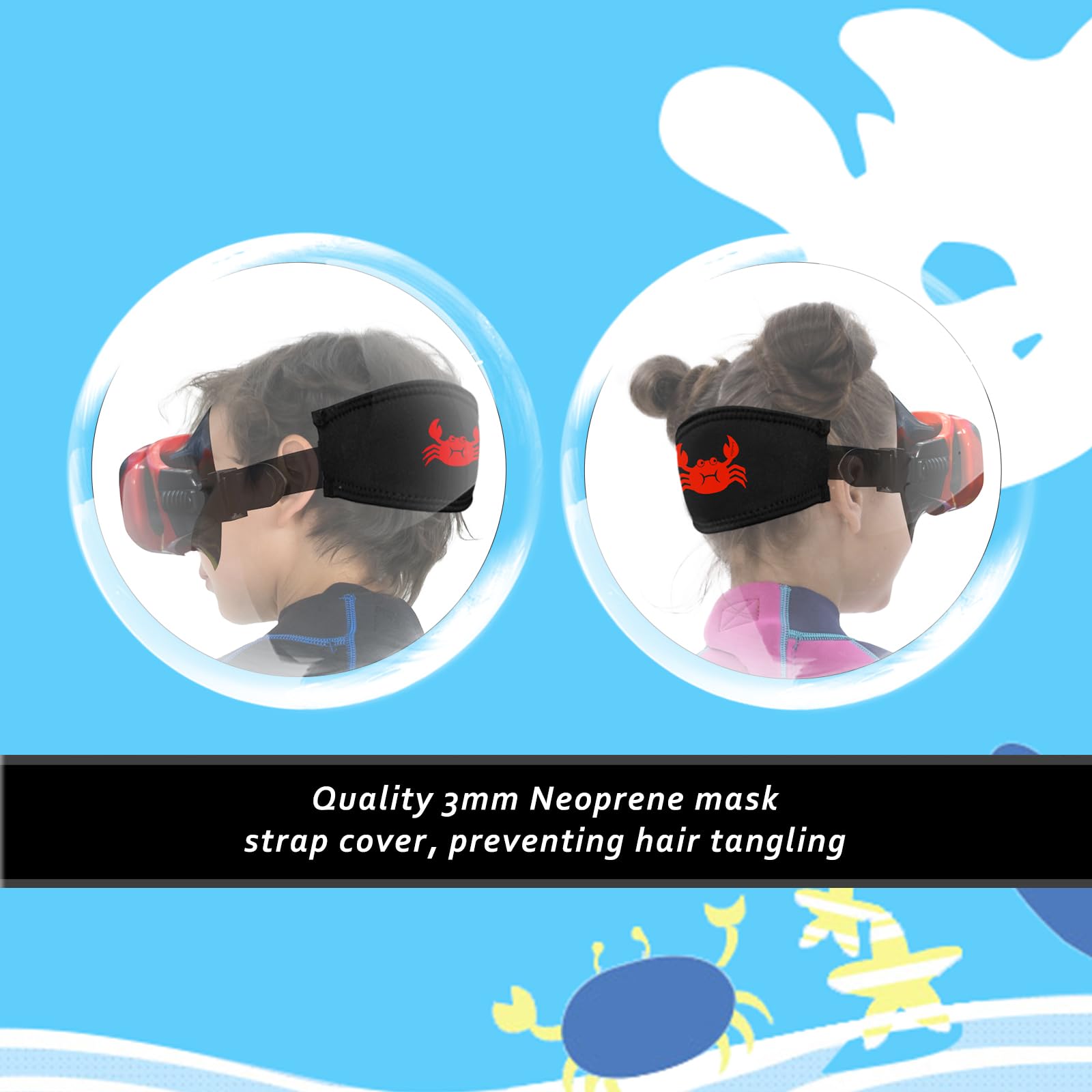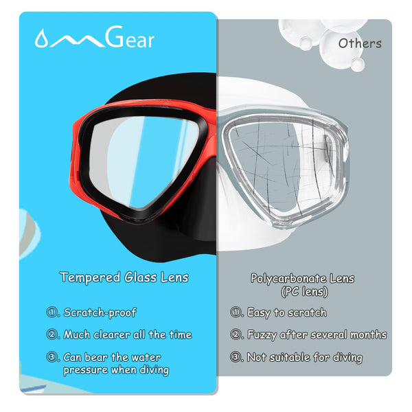 Premium Scuba Diving Swimming Snorkeling Mask Our silicone is soft, comfortable and perfect for your next underwater expedition The OMgear Kids swim mask comes with a 90-Day refund guarantee and a one year manufacturers warrantyBest quality materials Our swimming goggles are made by highly durable materials food grade silicone strap and skirt, tempered glass lens ,softy neoprene strap cover, providing extremely comfortable performanceFeatures Diving mask ( Pc frame) - water-tight ,100% leak-free - Tempered glass Lens, durable and safety even when deep diving - Easy-Adjustable side buckles and silicone strap (one size fits all ) -180APanoramic wide view, providing perfect underwater adventure-Enhanced comfort (silicone strap and skirt, neoprene band) Important advice -Do not jump into water while wearing this -When initial use, you can rub toothpaste on the inside of both lens with your finger for around 5 minutes, then wash with water This will be helpful for preventing lenses fogging After using every time, washing with fresh water can prolong life of your OMgear swim goggles with nose cover