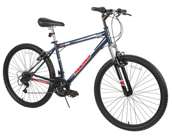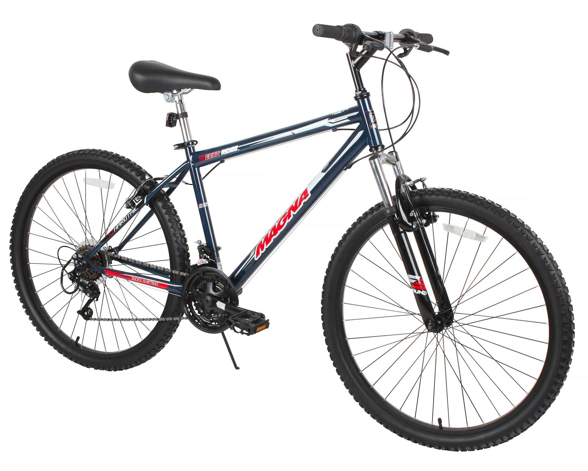 This sleek ride features a solid steel frame with a black and gray deluxe paint finish with custom graphics and white, black, and red accents. This super tough bike is equipped with a front shock designed to eat up the bumps, front and rear linear-pull brakes to make stopping a breeze, and 18-speed index shifter gears to make climbing a blast. And, with our super padded seat with quick-adjust seat post clamp, this 26-inch bike by Dynacraft is not only safe but comfortable and easy to set up too! If you are ready for adventure, grab the Magna Echo Ridge 26-inch bike and experience fun on the trails and pathways like never before!