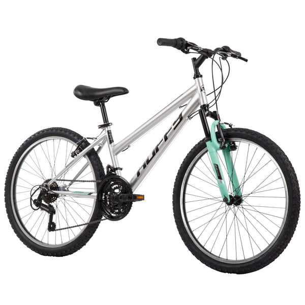 Fun adventure and a smooth ride are yours to be had on the Huffy Stone Mountain 24-inch womenAs MTB This ladiesA mountain bike features 21 speeds, all-terrain bike tires, front suspension, and dual linear pull brakes - the right kind of specs to make your ride all you want it to be The ATB tires and front suspension provide a smooth ride, no matter your terrain Use the 21-speed twist shifter to choose your gear needed for the path ahead of you, while the front and rear alloy linear pull brakes provide ultimate stopping power The stitched ATB saddle keeps you comfortable and the alloy quick-release lever allows for easy height adjustments Simple and sleek design, fantastic specs, supreme adventure - thatAs what youAll find on the Huffy Stone Mountain for women