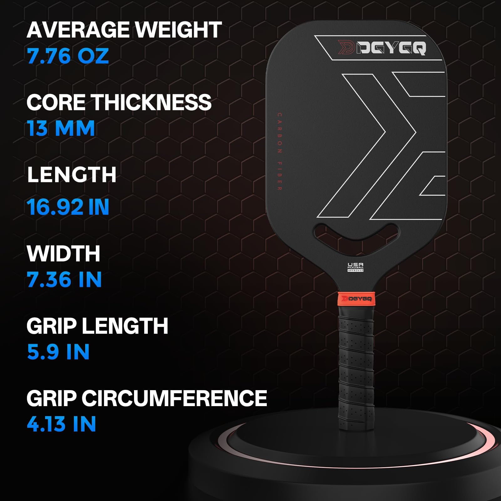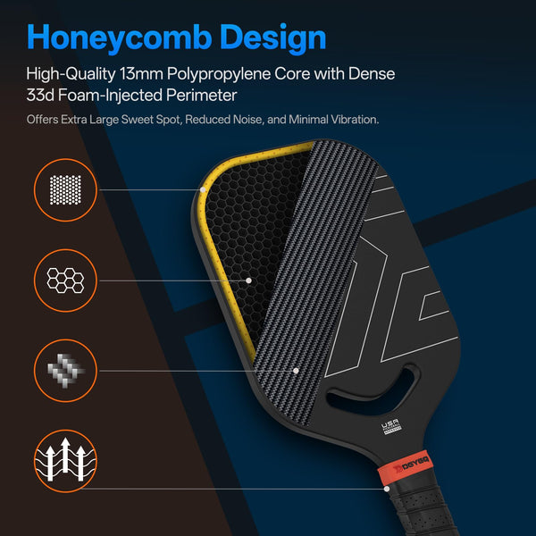 PEAK PERFORMANCE DESIGN: These pickleball paddles are meticulously engineered to deliver top-notch performance and comfort. Constructed with premium carbon fiber, they provide an unparalleled playing experience for players of all skill levels. | PREMIUM T700SC CARBON FIBER: Meet the DGYGQ Paddle, crafted with Raw carbon fiber for unmatched strength and stability. Built to handle intense gameplay, it gives you the competitive advantage you need to dominate the court! | EXTENDED HANDLE FOR POWER: Designed for two-handed backhand players, the extended handle enhances balance and offers added leverage for stronger, more powerful swings. | LIGHTWEIGHT PRECISION: At just 7.76 ounces, this paddle ensures quick responsiveness, effortless handling, and explosive shots, making it an essential tool for competitive players. | ENHANCED SHOCK ABSORPTION: Featuring a 13mm polypropylene honeycomb core and edges, this paddle effectively absorbs impact, ensuring smoother, more controlled shots for precision gameplay.