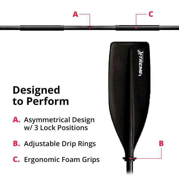 This popular SeaSense kayak paddle is the first choice in value and comfort. Designed to perform, our original kayak paddle features an asymmetrical design with 3 locking positions, which lowers wind resistance and enables anyone to achieve the best paddling posture and technique; adjustable drip rings keep your hands dry as you kayak, helping you paddle smoothly whether youre on the river, lake or ocean. Two piece construction offers easy storage, while ergonomic foam hand grips and a sturdy yet lightweight design deliver all-day comfort; plus, the paddle floats, ensuring its easy to find if you drop it in the water. With an aluminum construction and black molded plastic blades, this paddle is built to withstand even the harshest of elements. At SeaSense, weve been providing innovative marine and trailer products since 1984; weve rigorously tested and improved our entire catalog for decades to help deliver the best on-the-water experience possible.