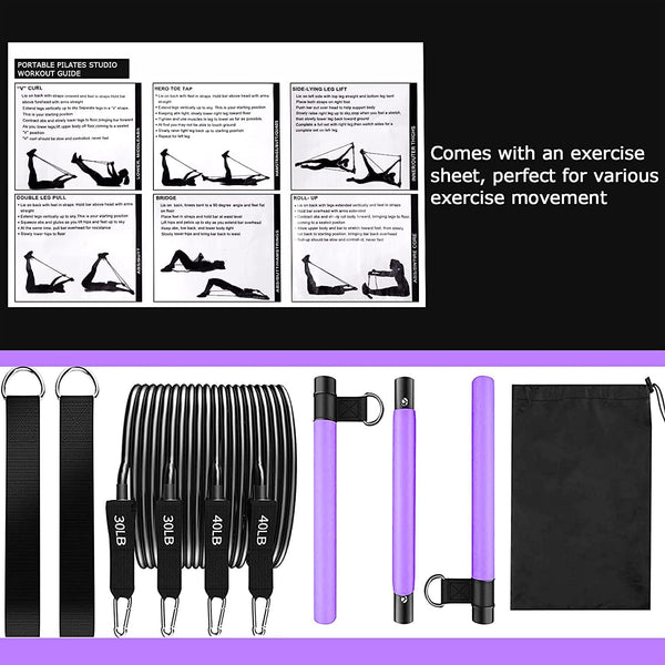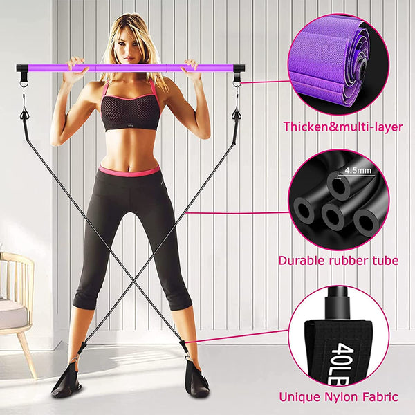 pilates bar kit with resistance bands is designed as an all-in-one fitness equipment that can shape the body, exercise muscles, reduce weight, and provide exercises that can be performed without a gym They have similar functions as barbells, rowing machines, tension bands, yoga kits, and other equipment Full Body Workout