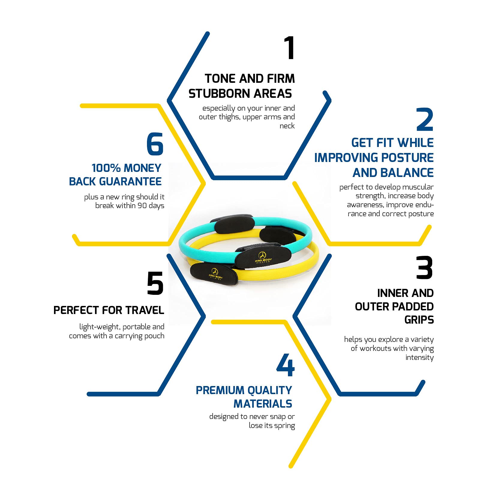 WANT TO MAXIMIZE YOUR WORKOUTS AND STRENgTHEN YOUR cORE Discover the ProBody Pilates Fitness circle and improve your muscle tone, and flexibility Like a thigh master, target your inner and outer thighs, upper arms and neck Take charge and unlock all the benefits of Pilates The Pilates circle was designed with your ApowerhouseA in mind - the area between the pubic bone and rib cage, from your front to back Introducing A convenient and Lightweight Thigh Exerciser for Woman The Pilates ring pro is a 14A composite fitness circle pilates ring protected by a plastic laminate and soft foam cover It is designed to never snap or lose its spring Enjoy years of use With moisture resistant padded grips on both the inside and outside you are free to explore a variety of workouts with varying intensity The form-molded grips fit comfortably against your body with professional-grade padding WeAre so happy with our quality, that should your resistance ring or magic circles for pilates break, we will support you for the life of the Pilates circle ring Meet those fitness goals for less than the cost of ONE month at the gym and you can have this revolutionary thigh master exerciser to firm those stubborn areas & supercharge your strength & mobility consider upgrading your suzanne somer thigh master with our pilates exercise ring Found in Pilates and PT gyms around the country, because of its versatile use The pilates ring professional is the only pilates circle with handles you need Our Pilate circle is a key tool in rehabilitation after surgery, some consider it a pilates ring heavy resistance No matter where you are in life, the Pilates ring magic circle is designed for beginners and seasoned athletes Low-impact exercises with the Pilates magic ring can help during post-surgery or physical therapy Help improve the strength of your calf, legs and core with a quick 30-minute Pilate rings workout Order your exercise circle ring today