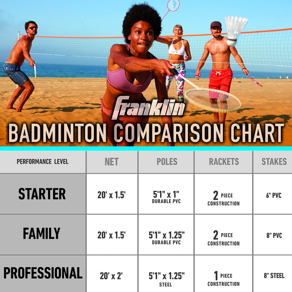 The Franklin Sports Badminton set is a classic outdoor game that will bring hours of fun for all ages. The set includes all you need for a day of fun: (1) Badminton pole set and net, (4) steel badminton rackets, (2) nylon birdies and (6) ground stakes/ropes. The Badminton set is easily transportable to your next picnic, BBQ or party and is sure to be a hit. Badminton is a timeless classic yard game that can be enjoyed by all ages...bring this set to your next gathering today!
