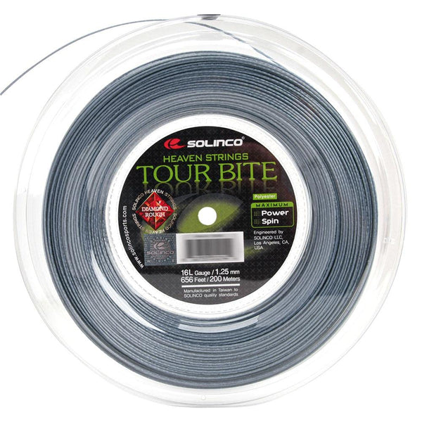 The Solinco Tour Bite Rough Tennis String Reel features a textured co-poly with a combination of spin and precision. The feel and response allows players to take big cuts on the ball. The string feels slightly softer than the original Tour Bite. Color: Silver. Gauge: 16L. MFG#: 1920080.