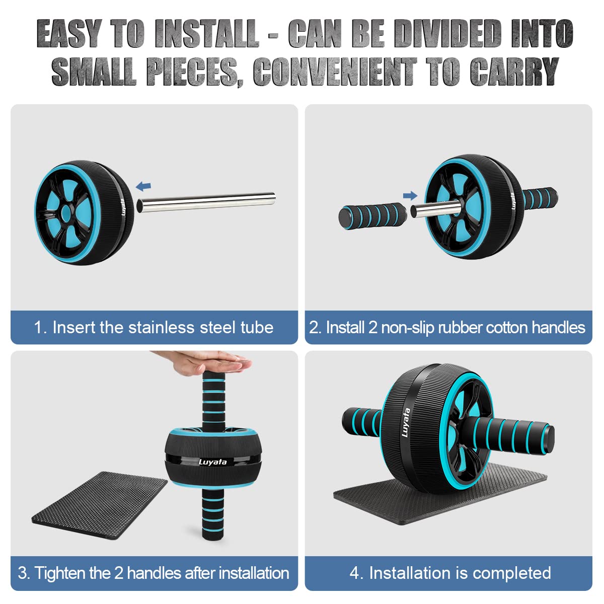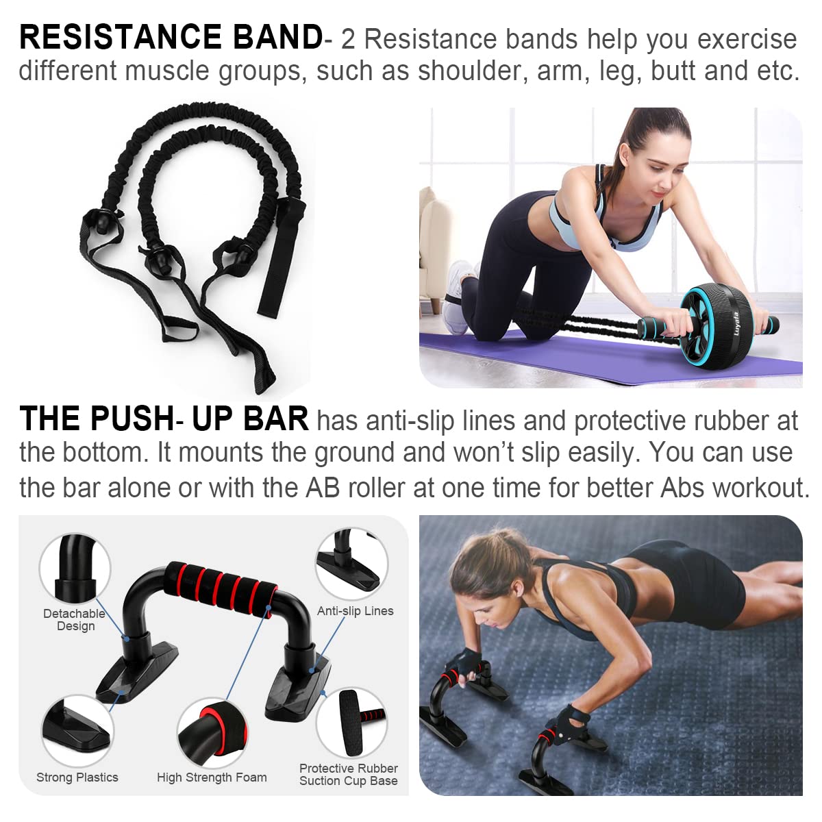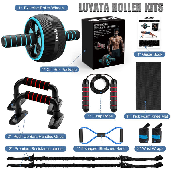 11 Pcs Ab Wheel Roller Kit : 1* AB Roller Wheel, 1* Thick Foam Knee Mat , 2* Resistance bands, 2* Push Up Bars Handles grips, 2* Wrist Wraps, 1* 8-shaped Stretched Band, 1* Jump Rope, 1* guide Book, 1* gift Box Package 11-IN-1 ultra-wide ab roller wheel is designed to help you build stronger, bigger abdominal muscles Improve your overall health and exercise at home, gym or office