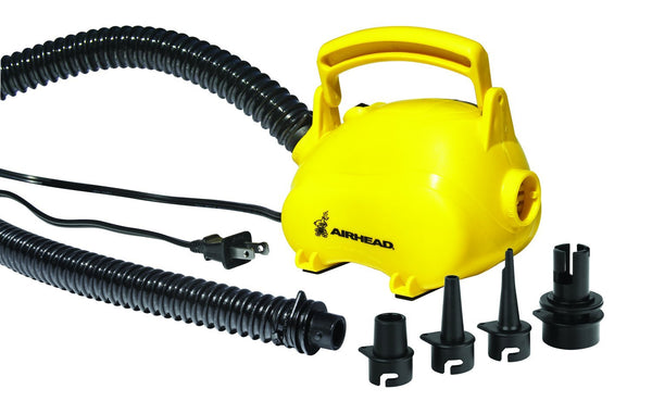 AIRHEAD AIR PIG 120v PUMP -This pump is called AIRHEAD AIR PIG to extol its high volume, high pressure capabilities. (It also happens to be shaped like a piggy bank.) The quiet motor puts out 2.2psi, plenty of pressure for most inflatables, including towable, boats, lounges and pool toys. Equipped with a 10' power cord with AC plug and a 24'' reinforced hose. Four adapters for the most popular air valves are included. Draws 3.5 amps/470 watts.