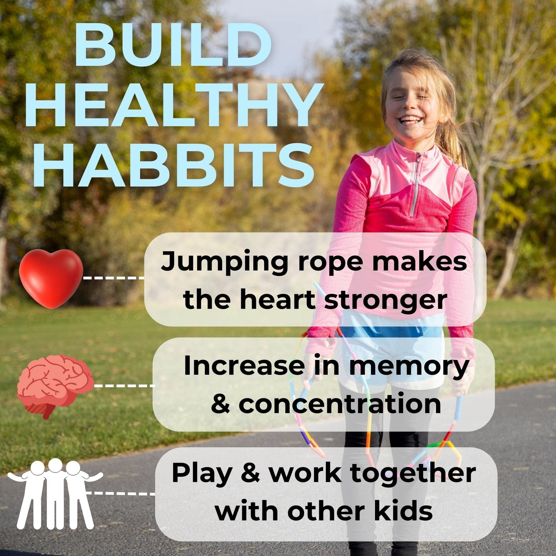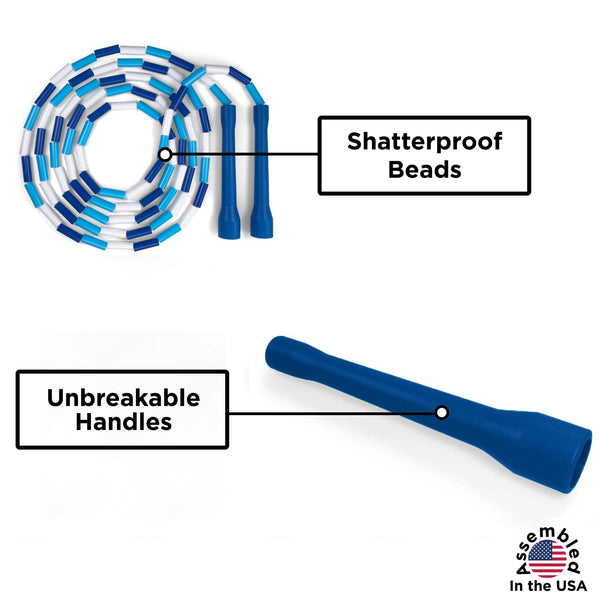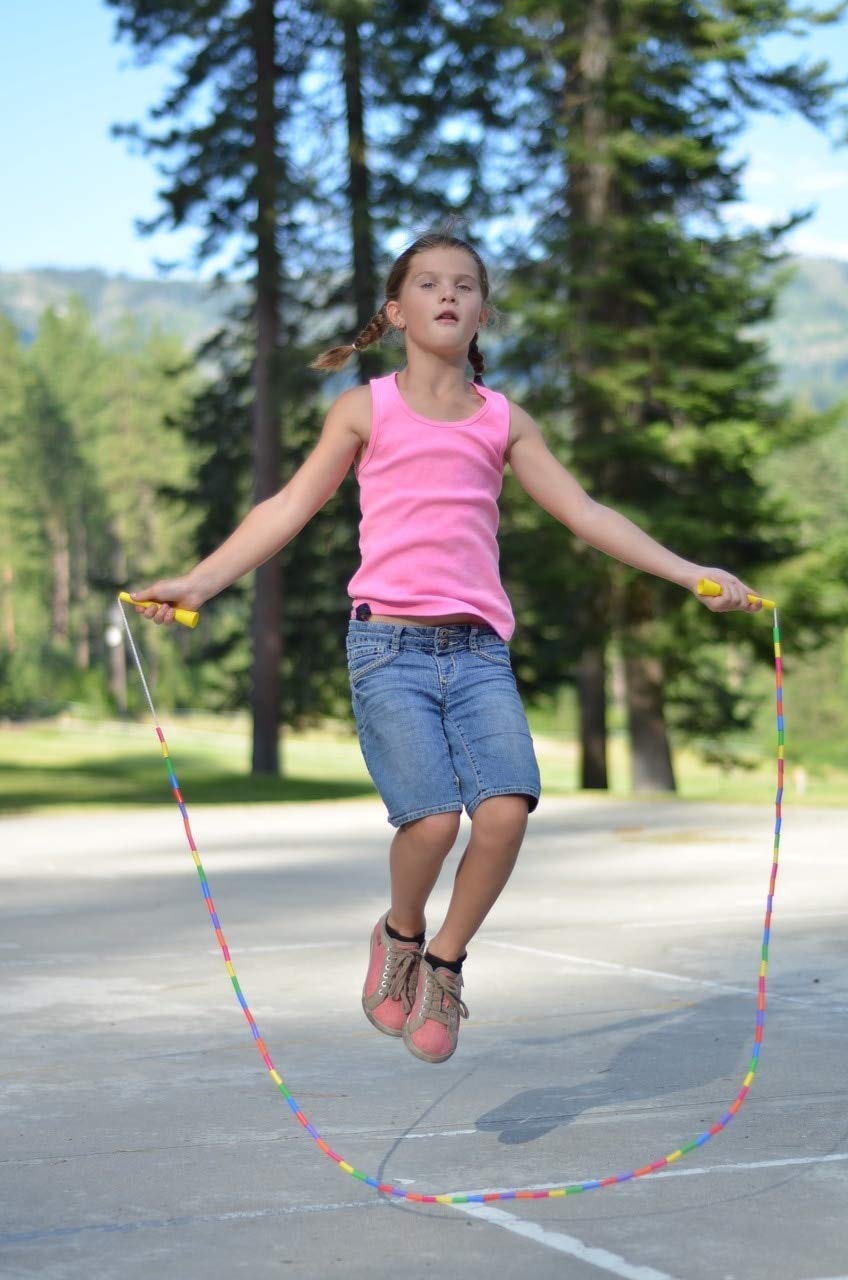 Sizing guide:7 Ropes Are Ideal for Students in K-1st grade (Under 5 2)8 Ropes Are Suitable for Students and Athletes from 5 3 to 5 6 Tall9 Ropes Accommodate Students and Athletes Up to 5 7 to 6 2 Tall10 Ropes Are Best for Anyone Over 6 3 (Or can Be Used as Short Double Dutch Ropes)The Beaded Kids Exercise Jump Rope are perfect companion for your childs active lifestyle Our jump rope is designed with durability in mind, featuring shatterproof 1-inch plastic beads securely strung on a solid braided nylon cord Our Jump ropes for kids are not only a fun activity but also a great way to instill healthy habits from a young age Our lightweight handles are easy for kids to grip, making jumping a breeze, and the segmented beads help prevent tangles, ensuring a smooth and enjoyable jumping experiencecustomizing the size of the rope is very simple Just untie the knot inside the handle, slip off the desired number of beads, and retie the knot If youre unsure about the size, we recommend starting with a 10-foot rope and resizing it according to your childs height This jump rope is incredibly popular among kids and schools, known for the satisfying tick tick clicking sound it makes on pavement or gym floors Its perfect for developing a consistent jumping rhythmOur sizing guide makes it easy to choose the right rope length based on your childs height, ensuring a comfortable and effective workout The Beaded Kids Exercise Jump Rope boasts features like shatterproof beads, affordability for schools and teams, a solid braided nylon cord for durability, and tough plastic handles built to last