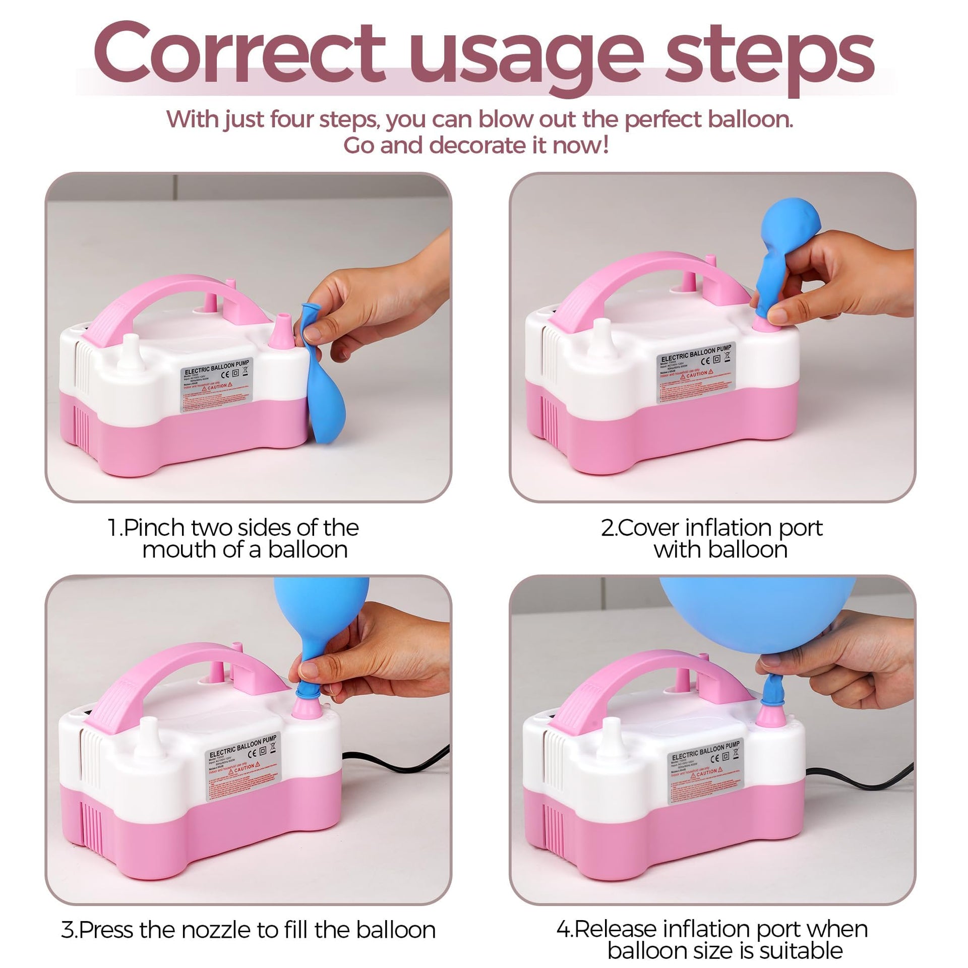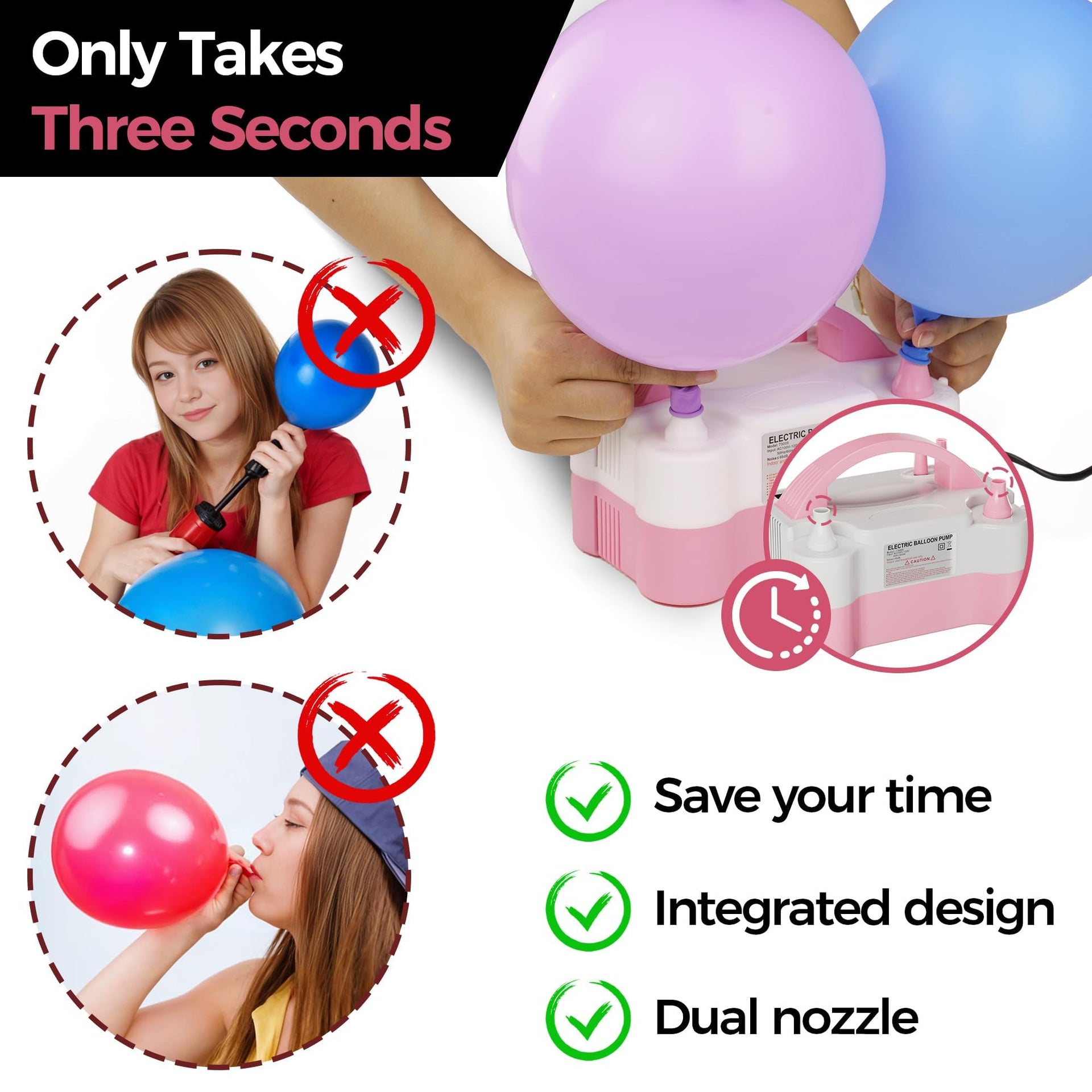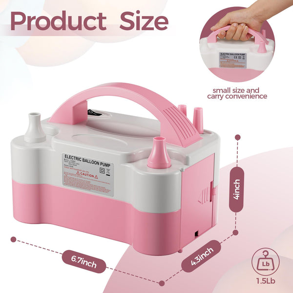 ?Time and Effort Saving?Efficient dual nozzle design allows for simultaneous inflation of balloons, reducing preparation time for parties and events. Compatible with a variety of latex and foil balloons. | ?Continuous and Push-to-Inflate modes?Push down and continuous mode options provide versatility and ease of use for different balloon sizes and quantities. Two small extension nozzles that fits smaller balloons. | ?Stable Inflation?Excellent air intake design and superior motor quality ensure the balloon pump can be used continuously for long periods of time, making it a go-to choice for event planners and decorators. | ?Portable and Compact?Portable and lightweight design allows for easy transportation and storage, making it ideal for on-the-go setup and execution at only 1.5LB. | ?Cost-effective and Efficient?Given that inflating balloons with helium is very expensive and inefficient, an inflator pump that fills balloons with air is a better option if you dont need the balloons to float.