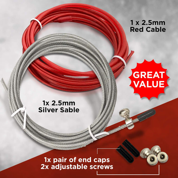 FIT VIKINGS SPEED JUMP ROPE REPLACEMENT CABLE What Youll Receive: 1 x silver jump rope cable (10ft/2.5mm) 1 x red jump rope cable (10ft/2.5mm) !!! Both cables are 2.5mm in diameter throughout to fit any standard mounting system 1 x Set of spare screws and end caps (2 of each) Try some cool moves with your new high speed rope cords: double unders, criss crosses, high knees, side Jumps and skips. Our customer service team is at your disposal 24/7 so please email us for any questions you might have about our FIT VIKINGS exercise jump rope. Dont wait, change your worn out jump rope cords right now!