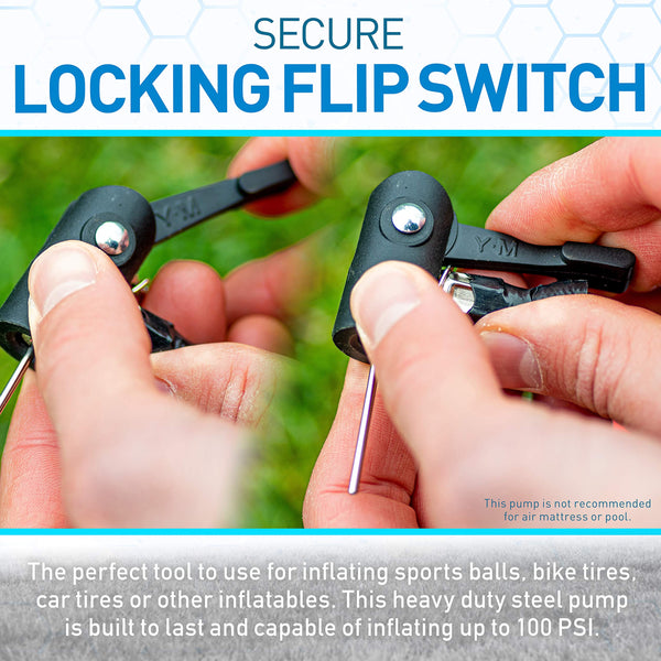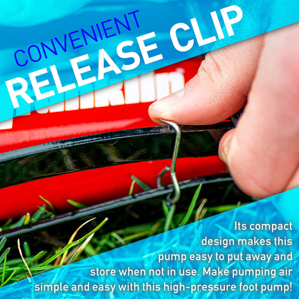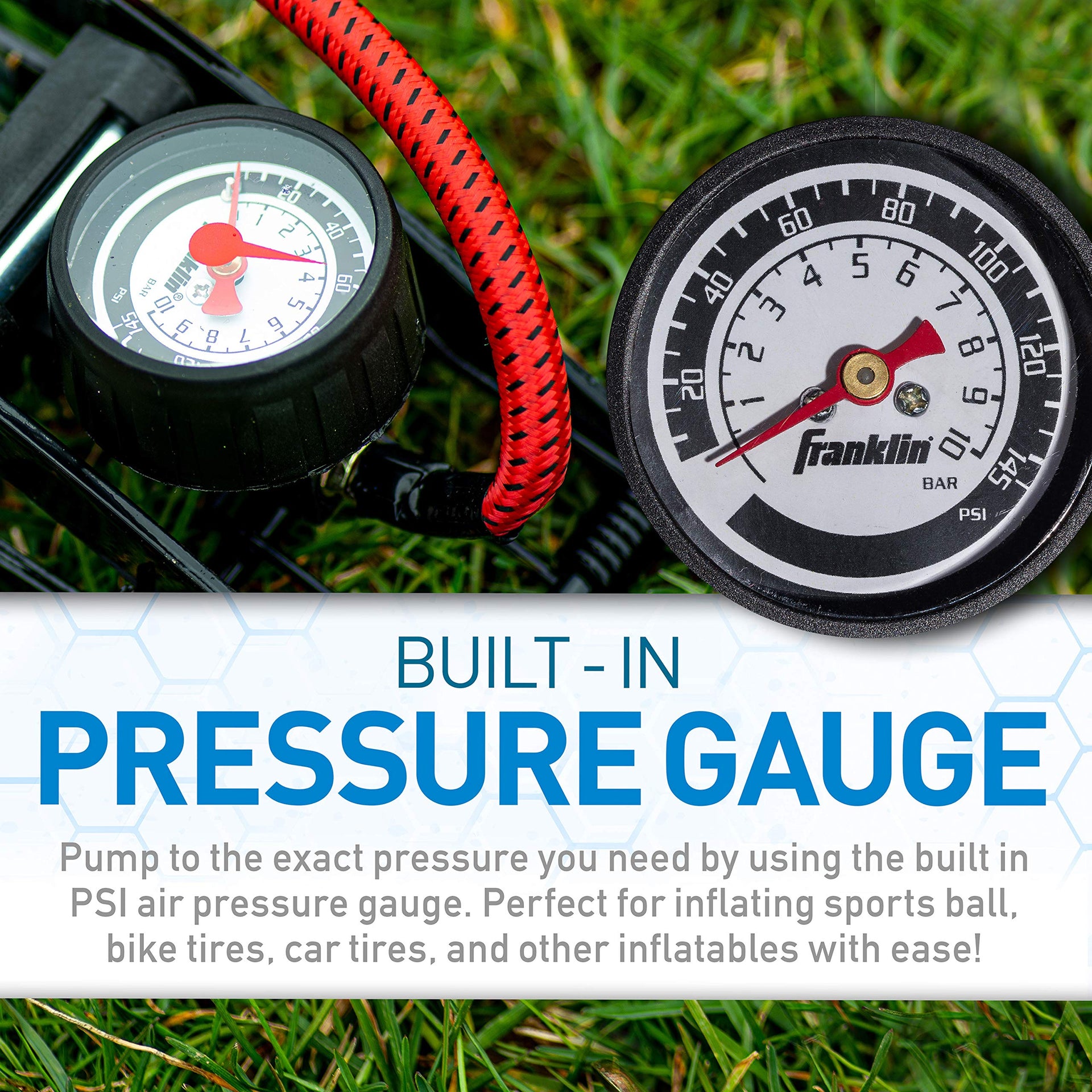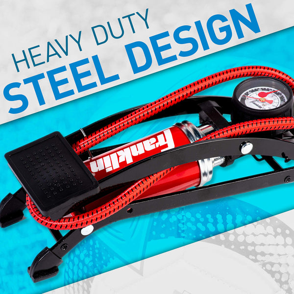 The Franklin Sports Foot Air Pump is the perfect tool to use for inflating sports balls, bike tires, car tires or other inflatables This heavy duty steel pump is built to last and capable of inflating up to 100 PSI With a built in PSI gauge and needle included you have everything you need to make sure you are inflating to the perfect pressure level Plus, with its compact design, this pump is easy to put away and store when not in use Make pumping air simple and easy with this high-pressure foot pump