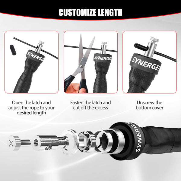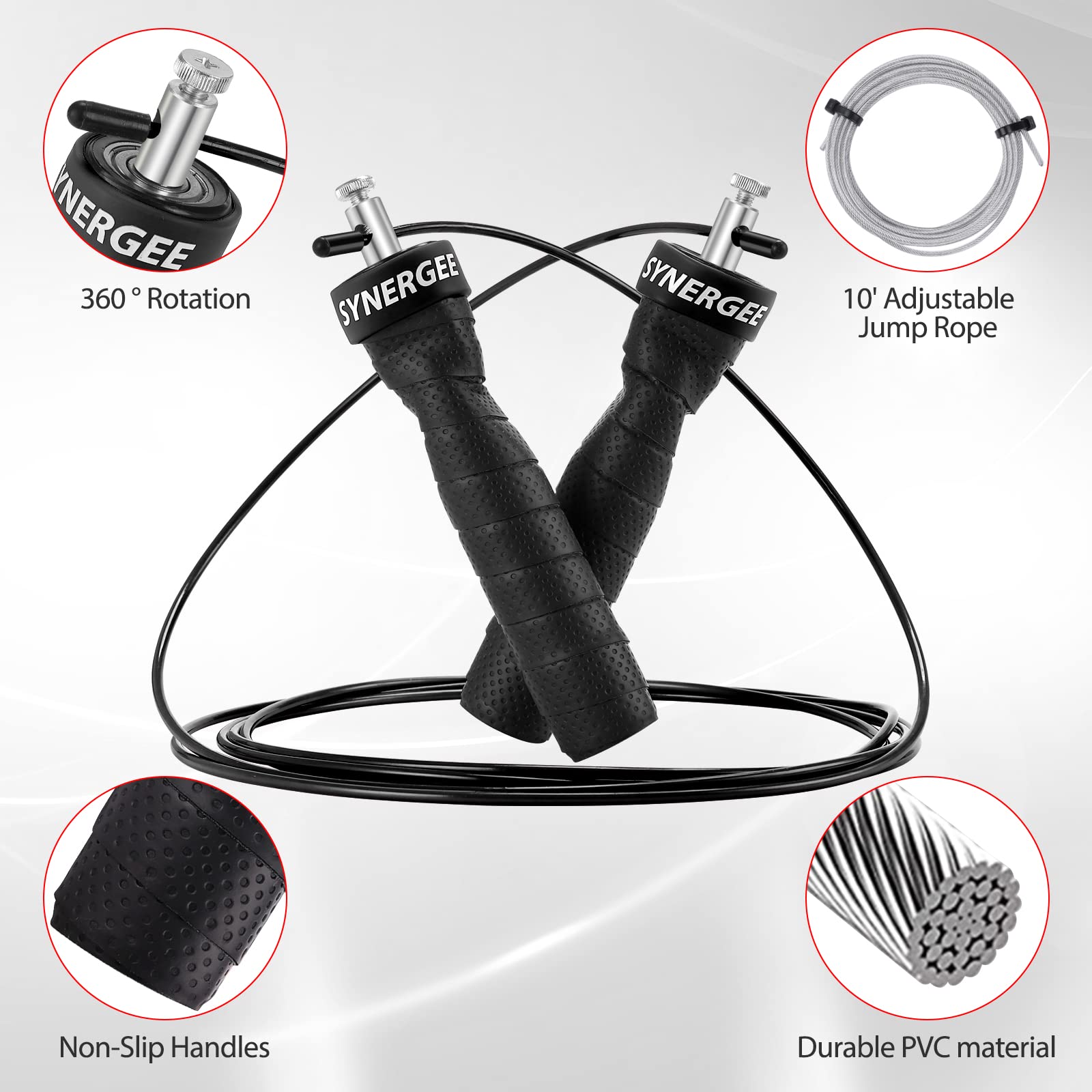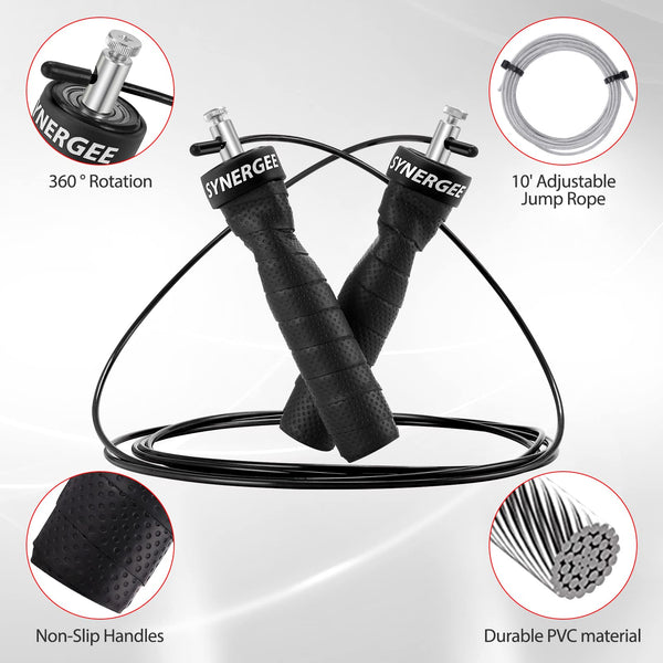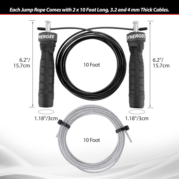The iheart Synergee Speed Jump Rope with 2 Adjustable 10 Ft Cables, Jet Black, is perfect for everyone - great for CrossFit, MMA, interval training, and circuit training, jump ropes are the ultimate way to add cardio into your routine. This rope is easily adjustable, lightweight, and portable. Our ropes are designed for serious, competitive athletes unlike the competitors jump ropes, which youd find on the playground. These Synergee ropes have ergonomically contoured handles that allow the athlete a natural, relaxed grip. This reduces fatigue and allows the athlete to jump longer. The contoured pinch point helps maintain rope shape. Get ready to smash your workout and crush your previous WOD times. Youll be at the top of the leader board in no time.