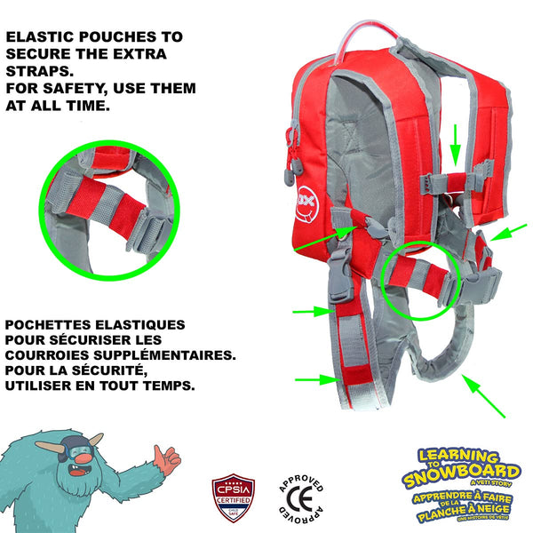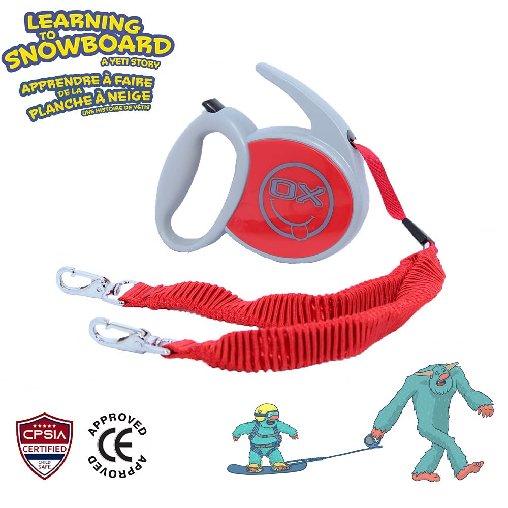 NEW Winter 2022 MDXOne OX with Yetis logos was designed with quality, comfort, and safety in mind The 16 foot retractable leash allows you to control the distance of your child on the ski slope with the push of a button The 12-inch bungee cord attachments allow your child to have the flexibility they need to learn and the shock absorption that you need to teach Designed with three different settings to help beginning snowboarders and skiers progress to the next level in their on-slope education The training harness was designed for functionality and comfort The high quality padded backpack harness is more comfortable for your little guy or girl on the mountain The backpack contains two zippered storage areas, one to store the leash and attachments while youAre riding the chairlift, and the other for the all important snacks on the mountain The backpack also has two reinforced handles that allow you to quickly and easily pick your student up from the snow or lift them onto a chairlift The hook on the leash will allow you to pick up your child off the snow with ease Just hook up the leash to one of the handle and up you go You can also hook up the leash to the bungees when riding with your child between your legs (skiing) or side by side (snowboarding) This system was initially designed by a parent for his child in order to keep him safer and more comfortable than the other harnesses out there on the market Make sure to purchase our hardcover childrens book Learning to Snowboard A Yeti Story and get your little one excited about snowboarding