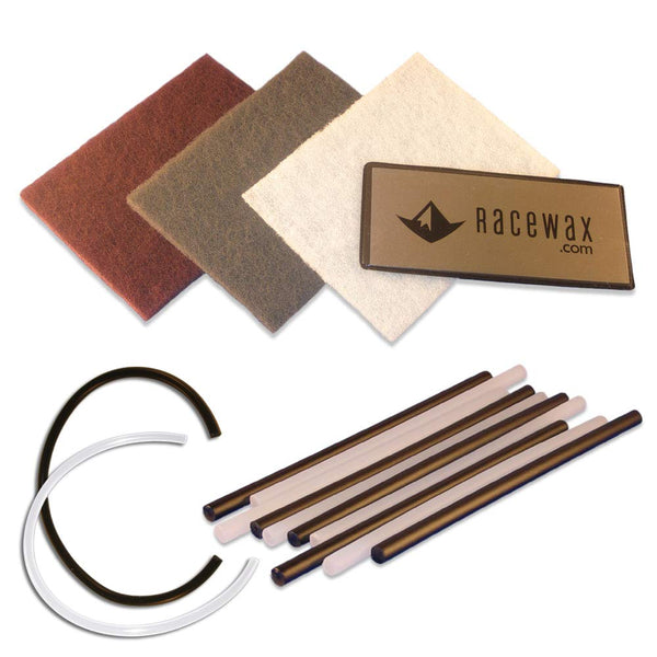 - Q: What is included in the RaceWax Core Shot Ski Base Repair Kit? A: The kit includes 5 clear P-Tex rods, 5 black P-Tex rods, a metal base scraper, three 3M base buffing pads (medium, fine, and non-abrasive), and two 1-foot ropes of Metal Grip (one clear and one black).