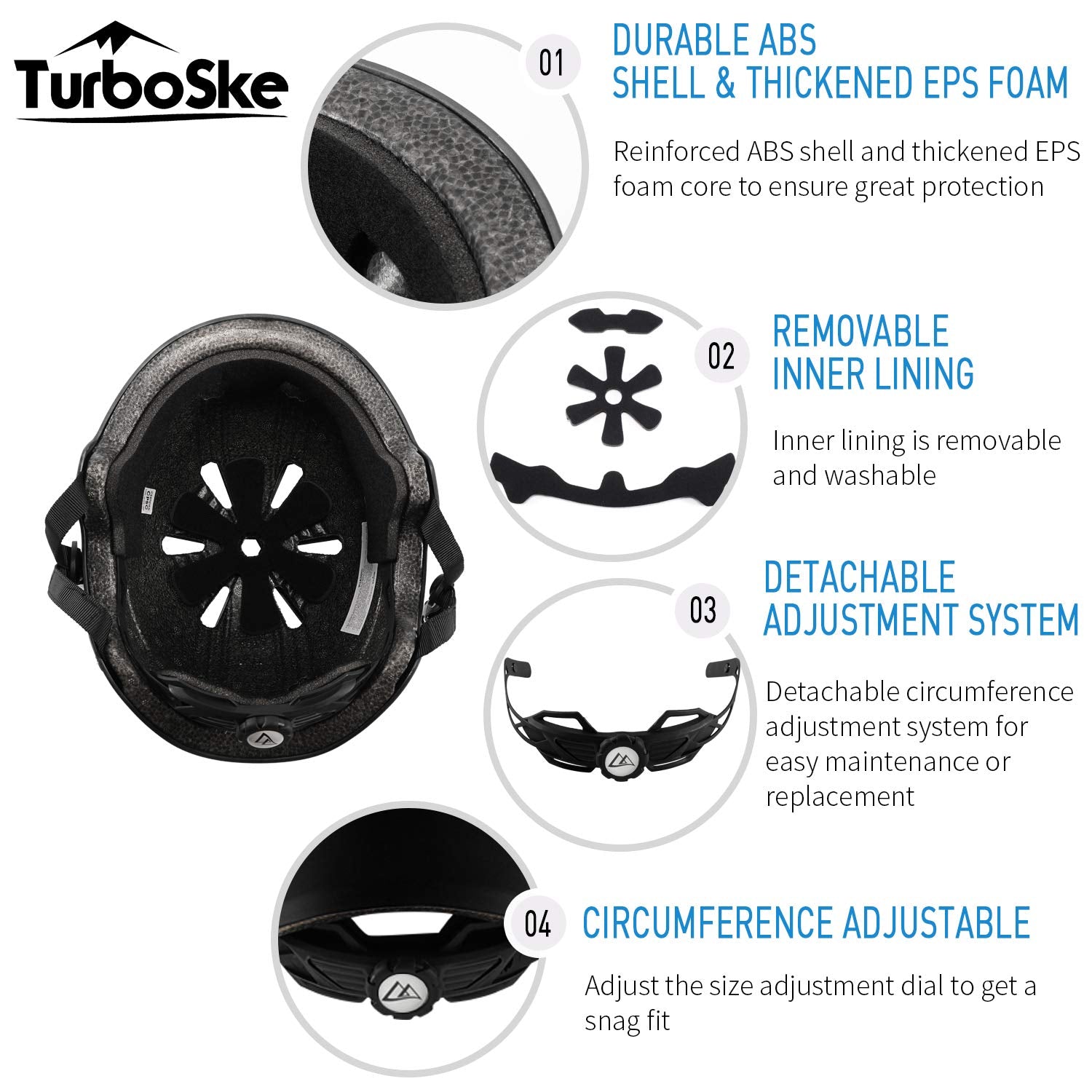 Protecting yourself from injury during skateboarding is very important and a helmet is arguably the most important part of your skateboard gear This TurboSKE helmet has a hard ABS shell and an EPS foam liner glued to the inside The hard-shell is a protective headgear that is both comfortable to wear and effective in reducing the risk of head injury Having full ventilation, without compromising head coverage, is important for the comfort of the person wearing the headgear Specs Material: ABS, EPS Safety Standard: 16 cFR part 1203 and cE Helmet Venting: 11 x Vents gender: Unisex Liner Removable & Washable: Yes Adjustable Fit: Yes Weight: 14 oz Warranty: 1 Year