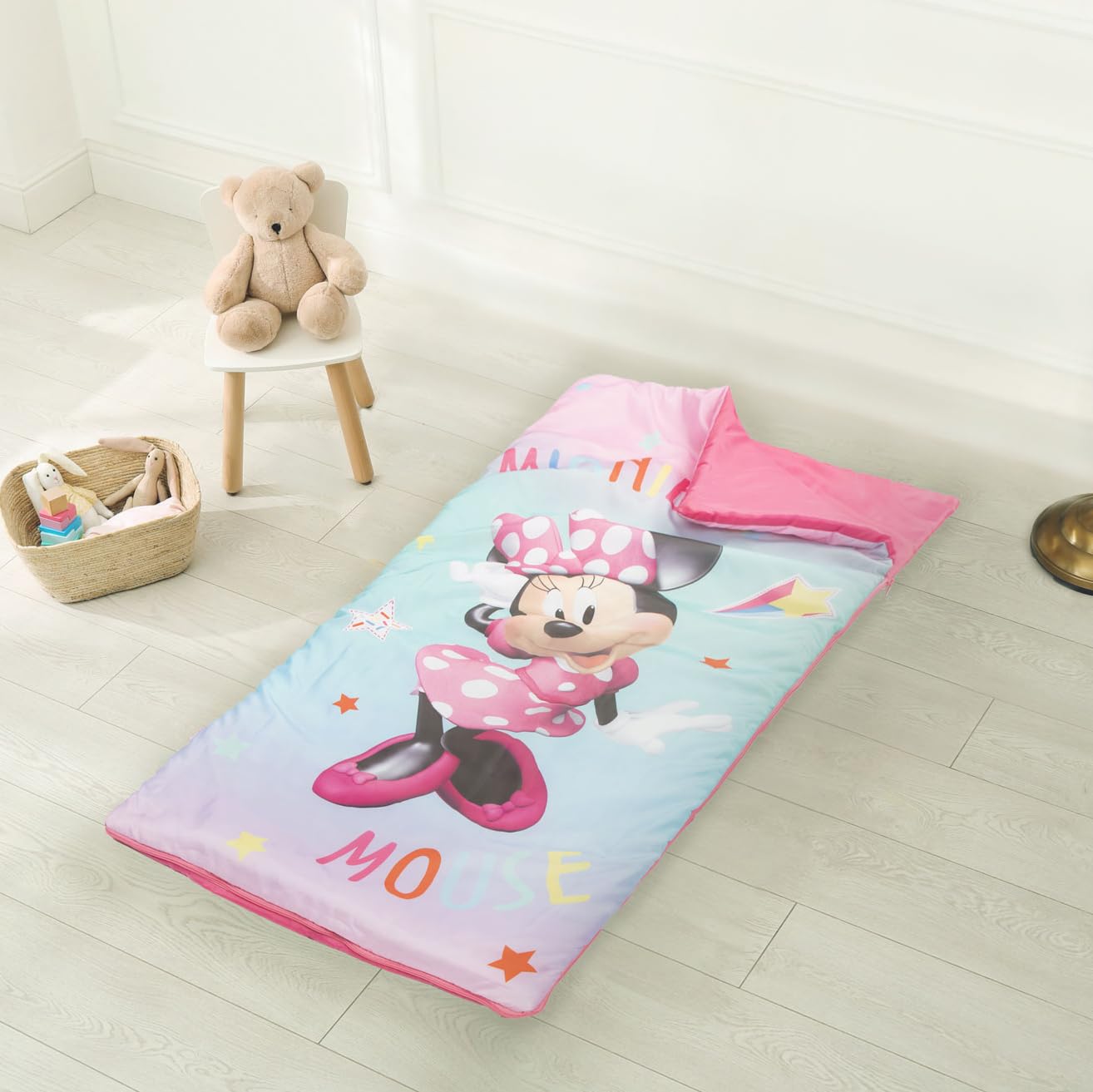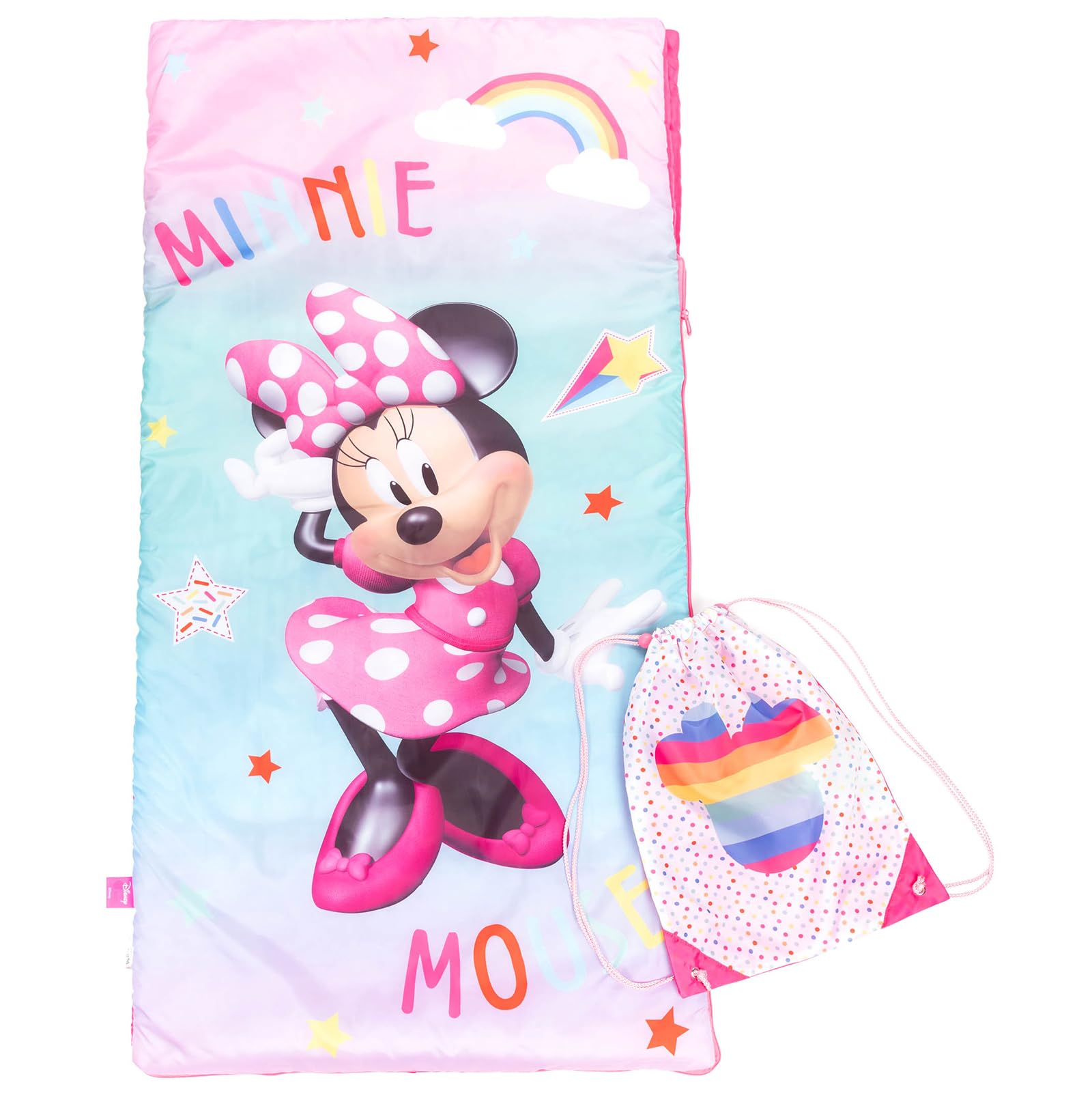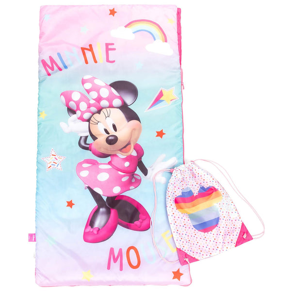 Sized just right for little ones, this Disney Minnie Mouse Slumber Sack will be the center of attention at the next sleepover. Your child can take their bedtime adventure anywhere. The side zipper of this sleepover bag makes getting in and out easy. This slumber sack is great for sleepovers, watching TV, naptime and much more. Slumber bag features your favorite Disney Icon, Minnie Mouse. Set includes (1) slumber bag and (1) drawstring sack. Slumber bag measures: 27'' x 54'' and drawstring sack measures 14''x 19''. Makes a great gift. For indoor use only.