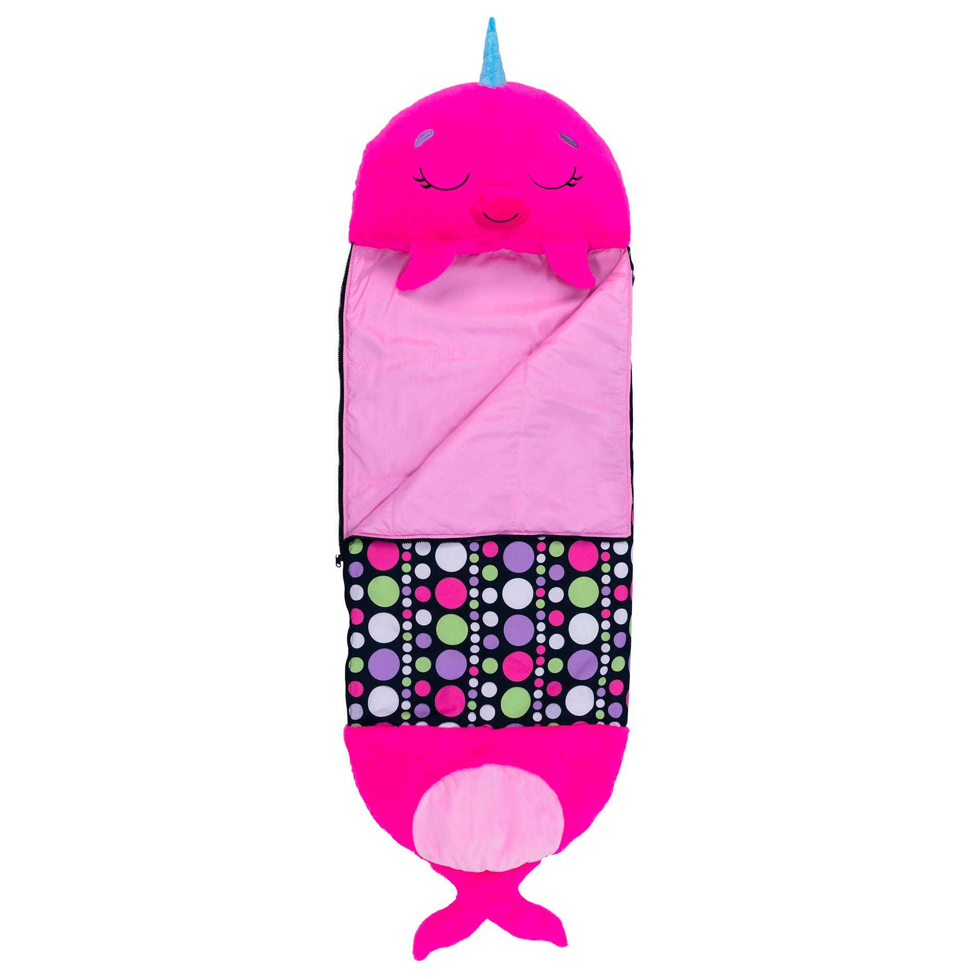 HAPPY NAPPERS: PILLOW & SLEEPY SACK: MED - NARWHAL - Happy Nappers, the perfect play pillows that pull open to a sleep sack surprise! Happy Nappers go from the perfect play pillow to a super soft sleeping bag with a simple pull n zip. Your child can snuggle up and nap inside of it. Theyre your go anywhere friends that play with you all day, then when its time to sleep, just pull on their feet! ZIP UP AND SNUGGLE UP in seconds Happy Nappers changes from the fun plush toy into a portable and fun sleeping bag with built-in toy. Its ideal for sleepovers and family visits or just for getting cozy. SUPER-SOFT QUALITY PLUSH: Happy Nappers are so soft for complete comfort! Machine washable: For your convenience. FUN CHARACTERS TO CHOOSE FROM IN 2 SIZES- Happy Nappers MEDIUM Size measures 54 L x 20 W or 4 Feet x 6 Inches and LARGE size measures 66 L x 30 W or 5 Feet , 6 inches. If your child is close to the max height, we recommend ordering the larger size for more comfort! Comfy, Cozy, Compact, Super Soft, Warm, All Season, Sleeping Bag with Pillow.