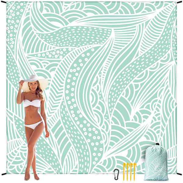 HIHOHO Beach Blanket, Sandproof Beach Mat, Waterproof Quick Drying Lightweight Outdoor Picnic Mat 79 ''x108 '' for 2-5 Adults with Pocket for Travel, Camping, Hiking about that product: -1* Sandproof beach mat; 4* durable anchor stakes; 1* carabiner; 1 durable carry bag. -This quick-drying, breathable blanket is durable and strong nylon. -The 120 ''x108 '' beach mat weighs 0.87 lb; it can hold 2-8 adults and easily folds into a 5.1 '' x 7.5 '' tote bag. -This stylish and beautiful Aztec patterned beach mat is suitable for many outdoor places such as beaches, parks, courtyards, and lawns. In addition, it can be used as a waterproof picnic blanket for fishing, hiking, camping, and other activities. Due to its multifunctional features, it makes a perfect gift for your family and friends. -The beach blankets are machine washable and will not be torn in the washing machine.
