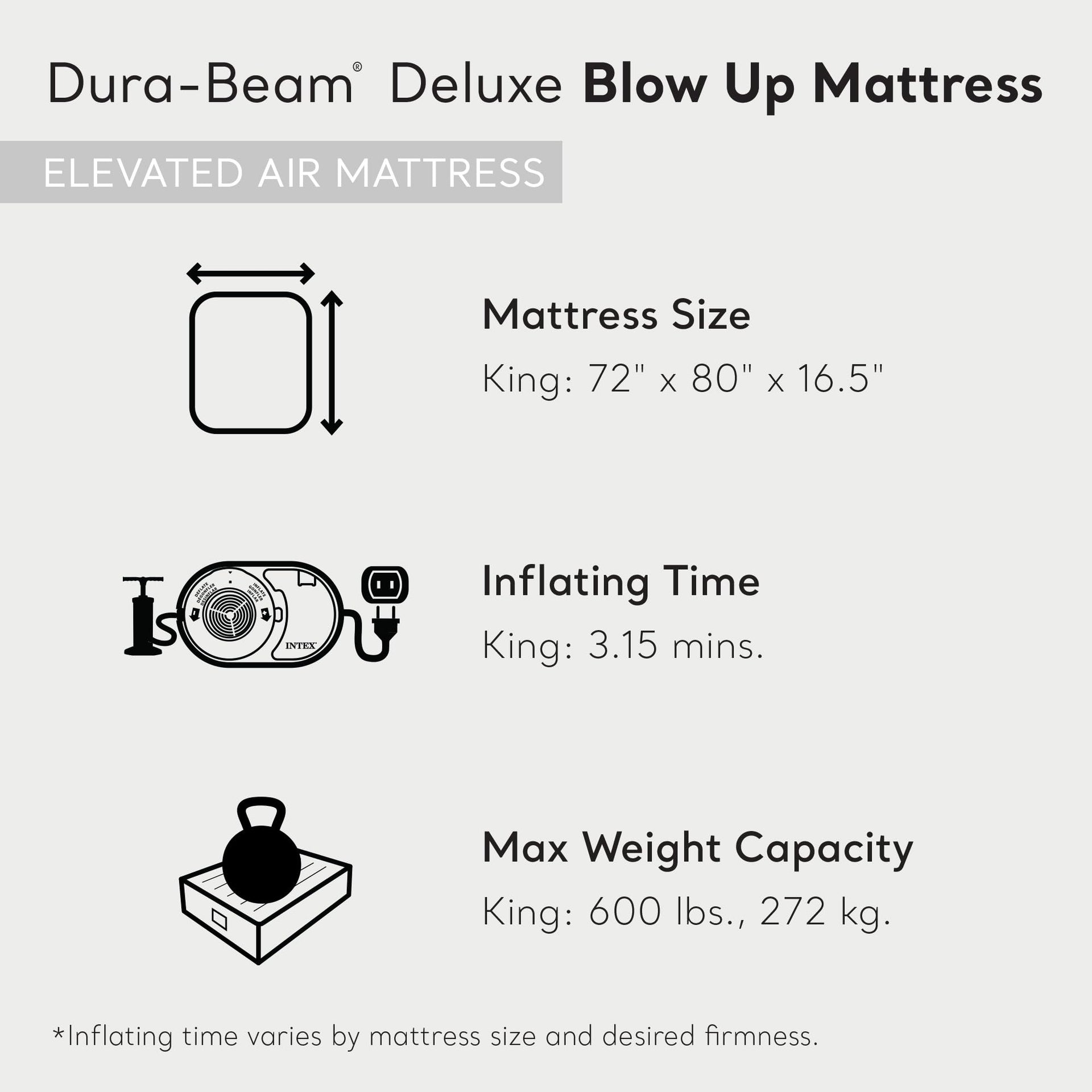Enjoy a good night's rest and a quick set-up on all of your camping trips with the Intex Blow Up Mattress Air Bed. Each relaxing king-sized air mattress is big enough to accommodate 2 people to rest on. Perfect to take camping or to use as an extra bed for house guests, these inflatable air mattresses feature Fiber-Tech interior construction for firmness and support. The velvety mattress top allows for comfortability and softness, making anywhere the perfect spot for sleep and relaxation. Raised 16.5 inches for your convenience, the air bed also has indented sides to help grip fitted sheets and an outer perimeter frame to provide additional stability and support. Each inflatable mattress comes with a built-in powerful internal pump for rapid inflation and deflation. With an approximate inflating time of 3.15 minutes, you can begin to use the air bed right away. For a great rest, convenience, and a no-hassle set-up, add these Intex Blow Up Mattress Air Beds to your next camping trip or guest room.
