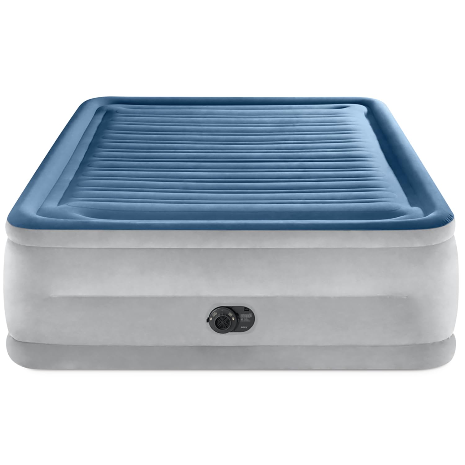 DURA-BEAM: COMFORT PLUSH AIR MATRESS - 22'' QUEEN - BLUE - Dura-Beam Deluxe Series - Your house guests will appreciate the luxurious comfort of this airbed provides. Fiber-Tech construction offers superior stability and exceptional durability. Soft dual-layer comfort top provides a smooth sleeping surface, ensuring a restful night's sleep. Convenient hand carry bag is included - perfect for storage and transport. 22'' in height. Fiber-Tech Construction. Dual-layer comfort top provides smooth sleeping surface. Unique edge and bottom ring construction provide superior stability. Mattress is raised for ease of getting in and out of bed. Powerful internal pump for rapid inflation and deflation. Approximate inflation time is 4 3/4 mins. Approximate inflated size 60'' x 80'' x 22''. Max weight limit 600 lb. INTEX's 1 Year Manufacturer Limited Warranty gives you peace of mind.