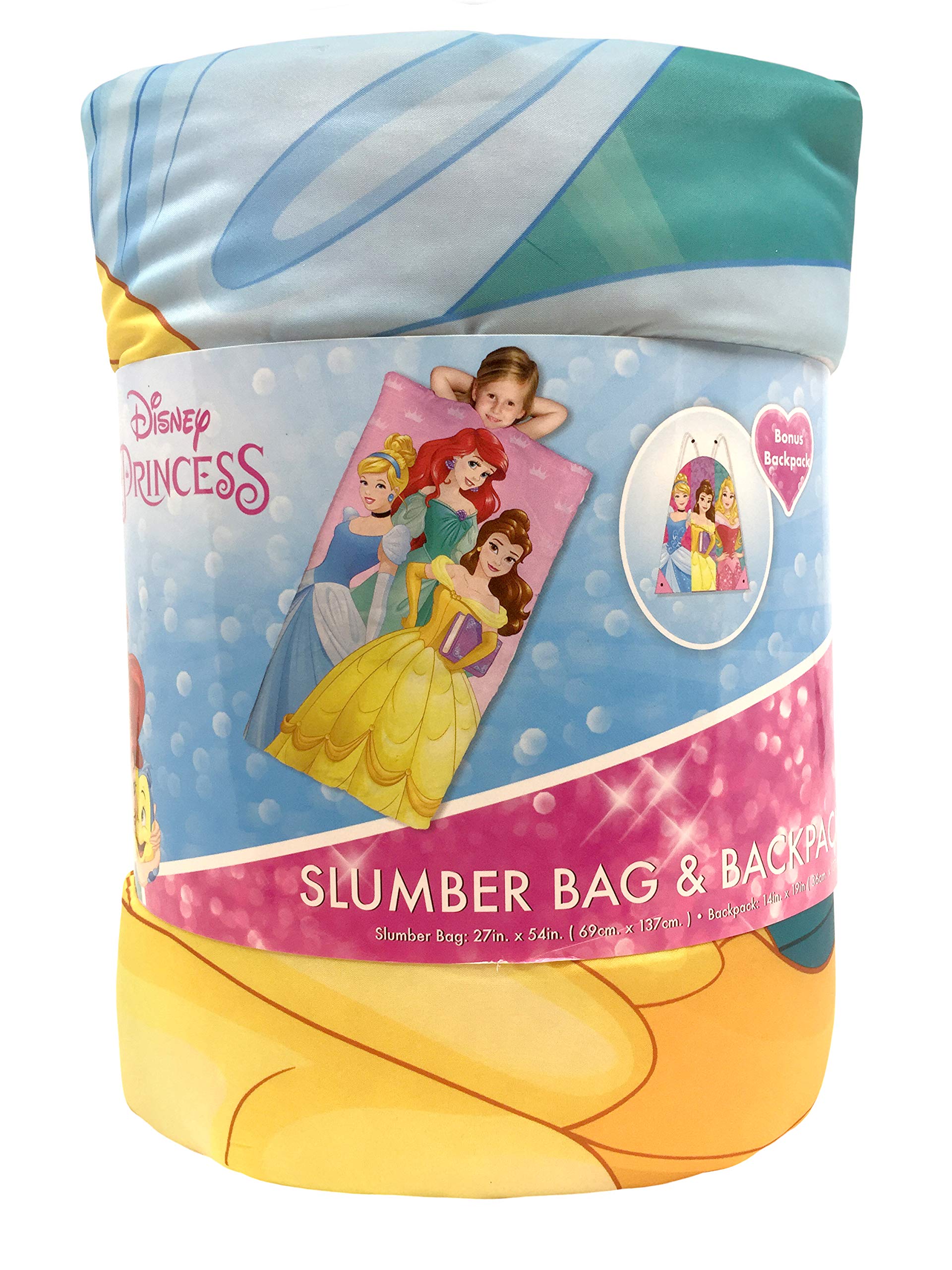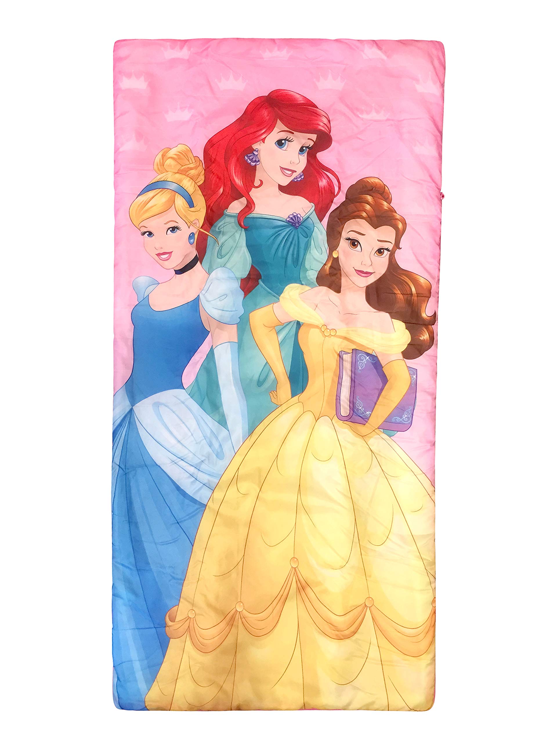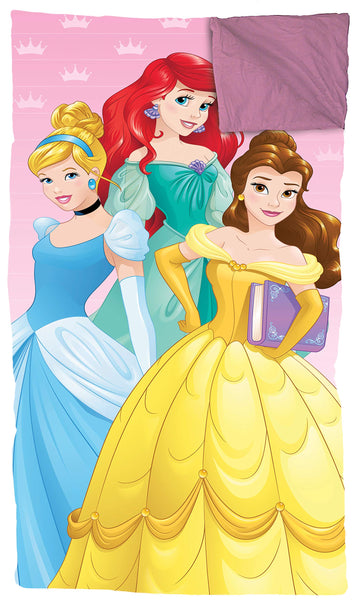 Sized just right for little ones, this Disney Princess Slumber Sack will be the center of attention at the next sleepover. Your child can take their bedtime adventure anywhere. The side zipper of this sleepover bag makes getting in and out easy. This slumber sack is great for sleepovers, watching TV, nap-time and much more. Slumber bag features your favorite Disney Princesses Ariel, Belle, and Cinderella. Set includes (1) slumber bag and (1) drawstring sack. Slumber bag measures: 27'' x 54'' and drawstring sack measures 14''x 19''. Makes a great gift. For indoor use only.