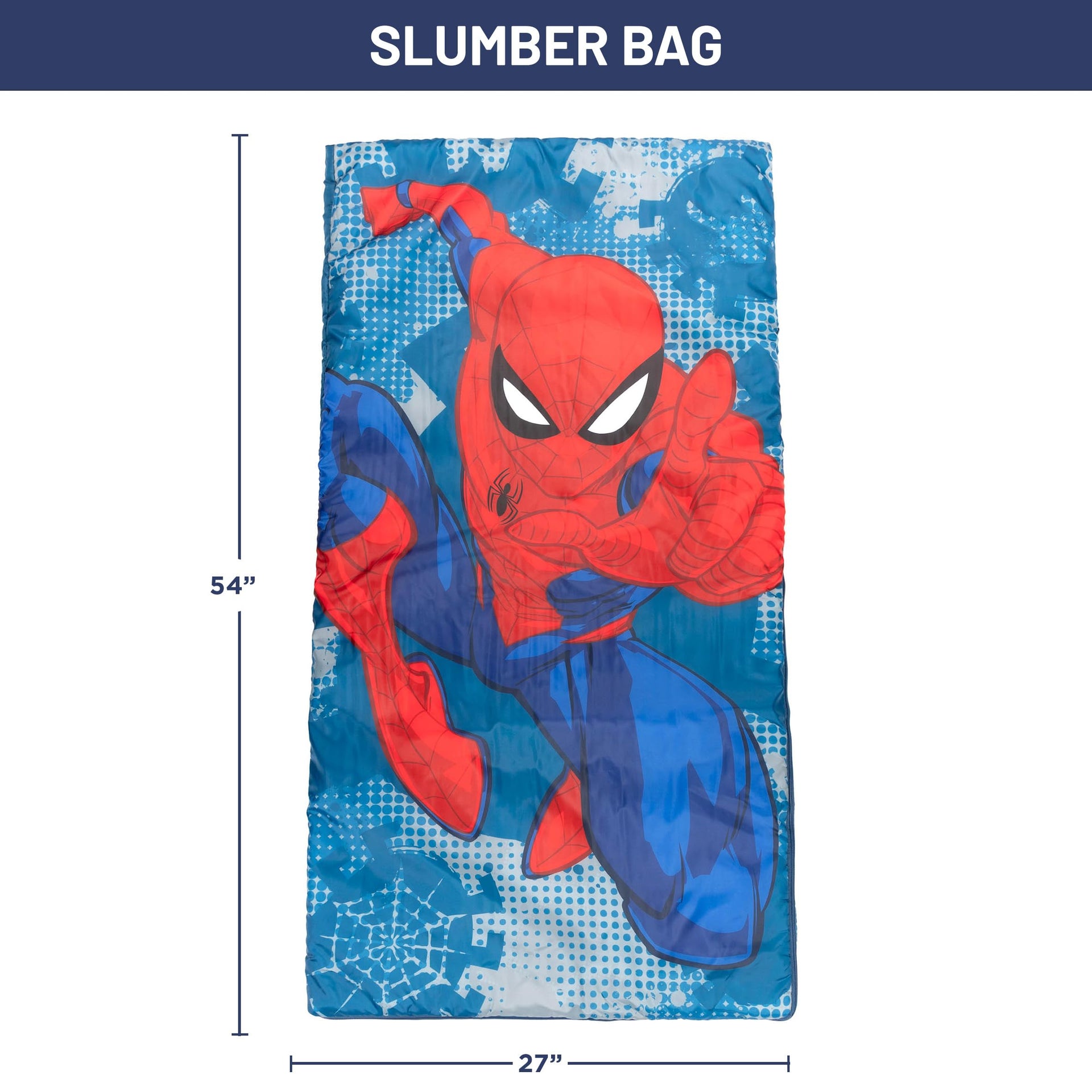 Sized just right for little ones, this Spiderman Story Slumber Sack will be the center of attention at the next sleepover. Your child can take their bedtime adventure anywhere. The side zipper of this sleepover bag makes getting in and out easy. This slumber sack is great for sleepovers, watching TV, naptime and much more. Slumber bag features your favorite superhero, Spiderman. Set includes (1) slumber bag and (1) drawstring sack. Slumber bag measures: 27'' x 54'' and drawstring sack measures 14''x 19''. Makes a great gift. For indoor use only.