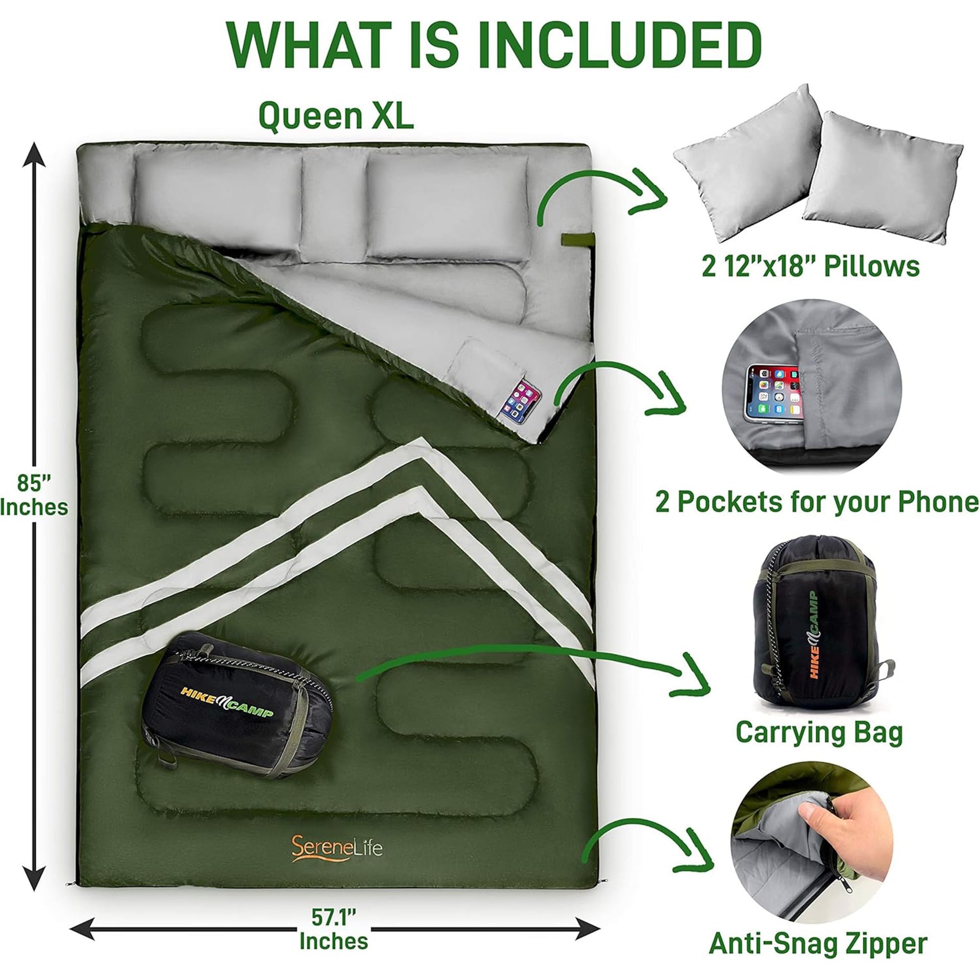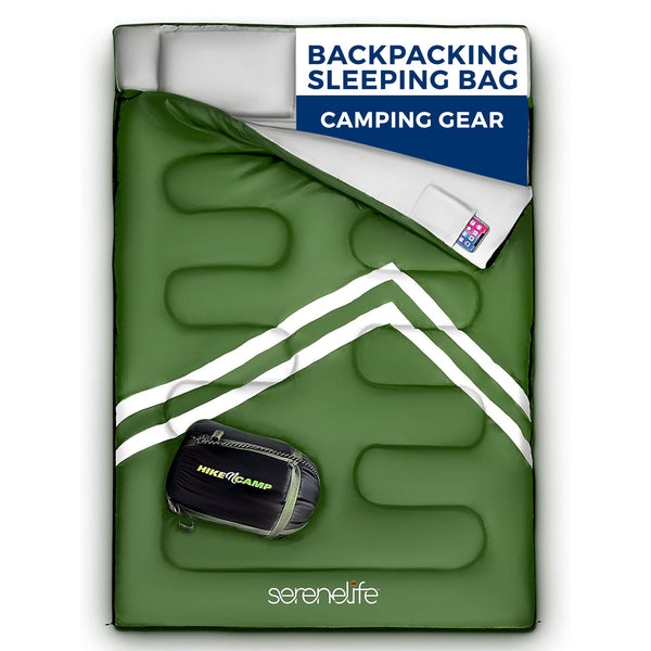 This double sleeping bag comes with two pillows and is perfect for adults or teens. It is lightweight and waterproof, making it ideal for camping, backpacking, or hiking. The sleeping bag is portable, featuring a soft 210 thread count material, and includes an anti-snag zipper that opens on both the left and right sides for easy access. Designed for extreme weather conditions, it has a sturdy, waterproof outer liner to keep you warm and dry. Additionally, it comes with a convenient carrying bag for easy transport. Crafted from high-quality materials, it ensures durability and comfort in the outdoors.