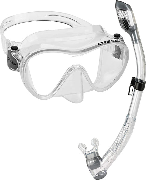 cressi Frameless Mask: Increase your visibility with the cressi Frameless Snorkeling & Scuba Mask This high-quality mask features tempered glass lenses, a durable silicone skirt and push button buckles for quick strap adjustment The maskAs lightweight silicone seals securely and gently to the face while reduced size and volume makes clearing the water easy The Frameless Mask from cressi offers top-notch quality, so you can explore the waters in comfort cressi Dry Snorkel: Innovatively designed to keep water out when submerged and on the surface, the cressi Supernova Dry Snorkel will help you breathe easy A unique splash guard at the top reduces water entrance when snorkeling, while the completely dry top and bottom purge valve make for easy, underwater swimming The silicone mouthpiece offers a comfortable fit, allowing you to explore hours on end
