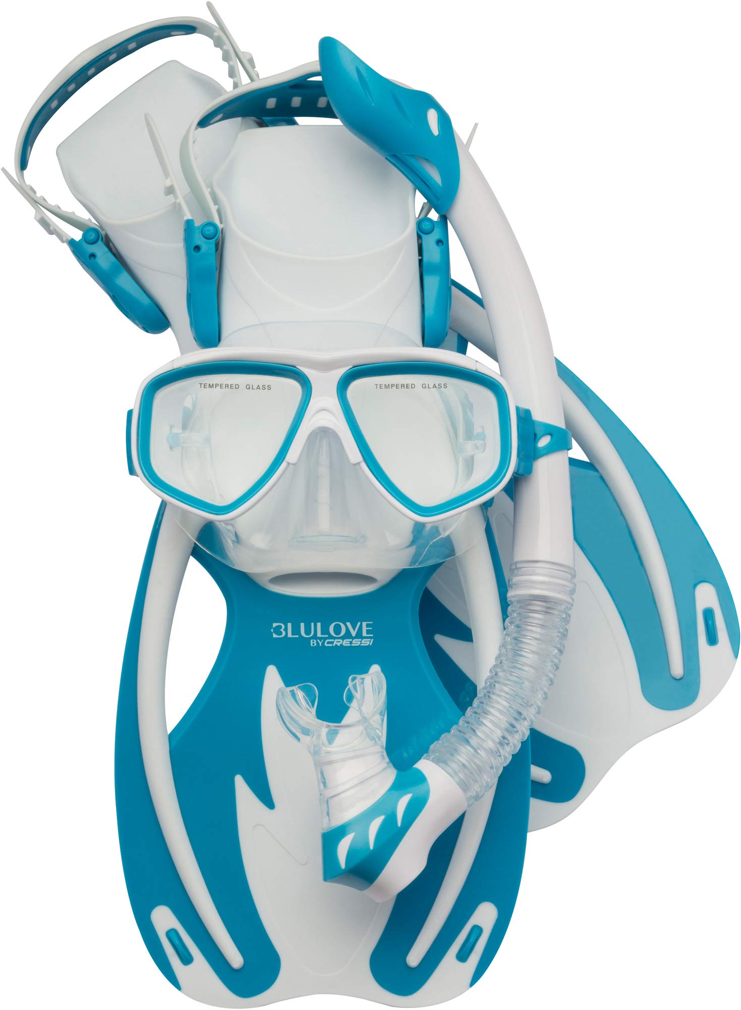 Rocks Kids Set is cressis answer to the price conscious parents who need reliable snorkel equipment for their kids for vacation use We offer with this line the solution for adventurous kids who need decent quality for all day use in the pool or in the ocean The Rocks Mask lenses are made from tempered glass and the dual window design provides excellent and a wide field of vision Mask has an easy-to-reach nose pocket for ear equalization The snorkel features the splash guard designed to prevent splashed surface water from entering inside the snorkel barrel The soft and replaceable mouthpiece, in combination with the flex tube section, allow for hours of comfortable snorkeling fun The one-way purge valve below the mouthpiece allows and water in the tube to drain-rapidly The snorkel comes complete with an easy-to-use snorkel keeper for attachment to the mask strap Soft and comfortable vented open heel foot pocket with easy to adjust buckles designed to follow the kidAs growth The strap has a Quick-Release Easy-Adjust buckle with large-thumb-loop for easy donning and doffing Dual composite vented blades provide excellent power and energy saving efficiency The product is designed in Italy by cressi and made in china cressi has been a brand pioneer in scuba diving, snorkeling, and swimming equipment since 1946 The product is covered by a 2-year limited warranty