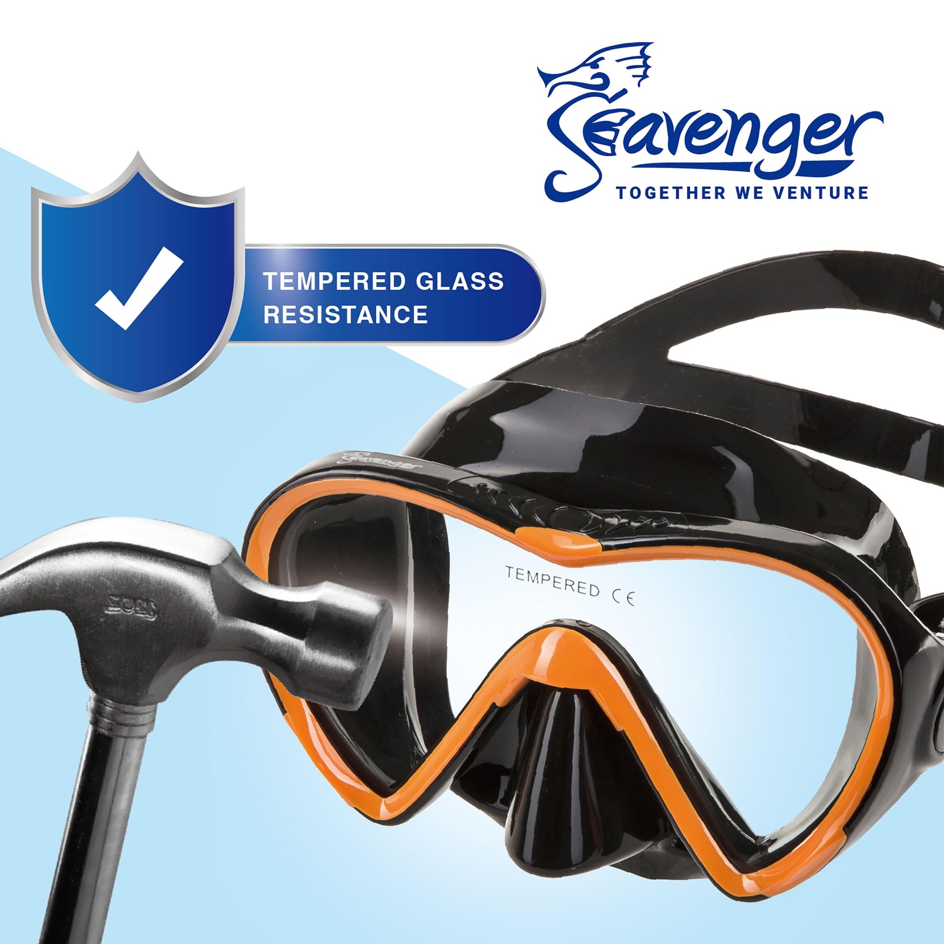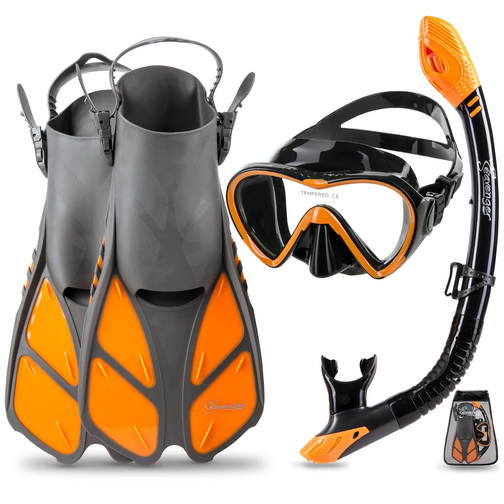 Seavenger Diving Dry Top Snorkel Set With Trek Fin, Single Lens Mask And Gear Bag, L/Xl - Size 9 To 13, Gray/Black Silicon/Orang