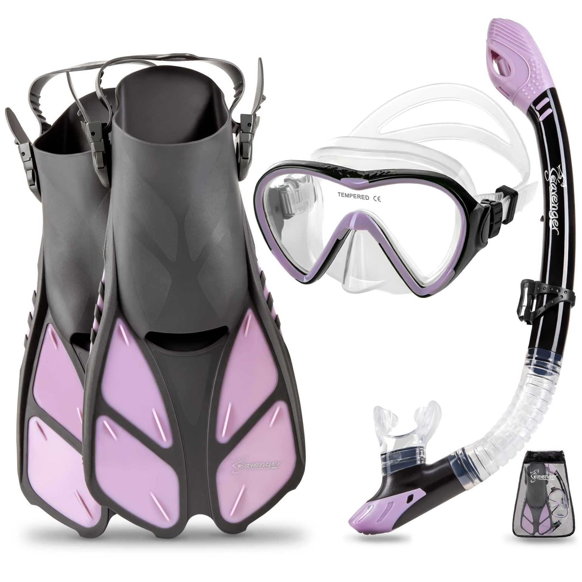 Seavenger Diving Dry Top Snorkel Set With Trek Fin, Single Lens Mask And Gear Bag, S/M - Size 4.5 To 8.5, Gray/Lavender