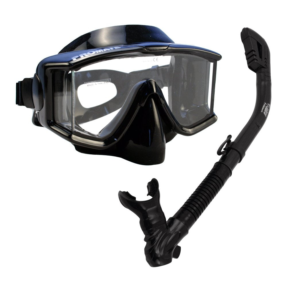 Promate Side-view Edgeless Purge Mask: Patented purge design. Patented channeled skirt design directs bubbles away from view. Ideal for medium to large faces. Crystal, liquid silicone injected skirt and strap. Double skirt edge comfort seal. Low volume. Swivel and adjustable buckles. Tempered glasses. Made in Thailand. Promate dry snorkel is the fully submersible dry top snorkel with one way purge valve. Quick disconnect retainer design easily make accommodation of snorkel from mask. Colored whistle housing to get attention easily. Flexible silicone corrugated low section, Pre-curved silicone mouthpiece.