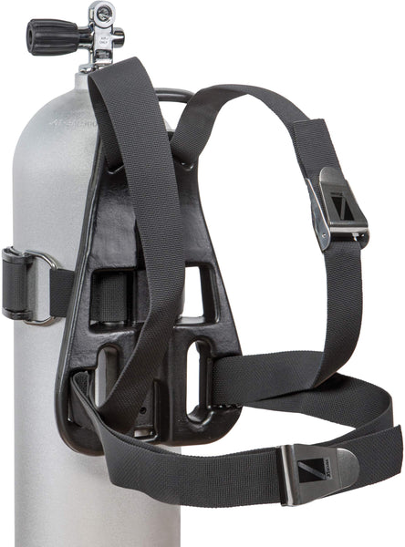 Traditional single tank backpack. Blow molded plastic pack. 2'' black harness webbing. Adjustable tank band with cam buckle. SS Quick-release buckles at shoulder and waist.
