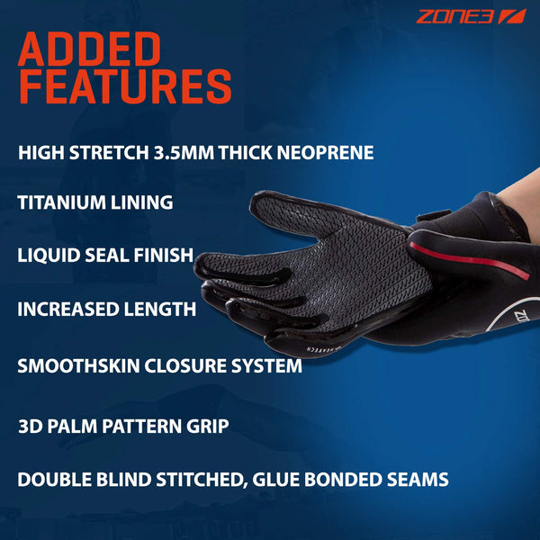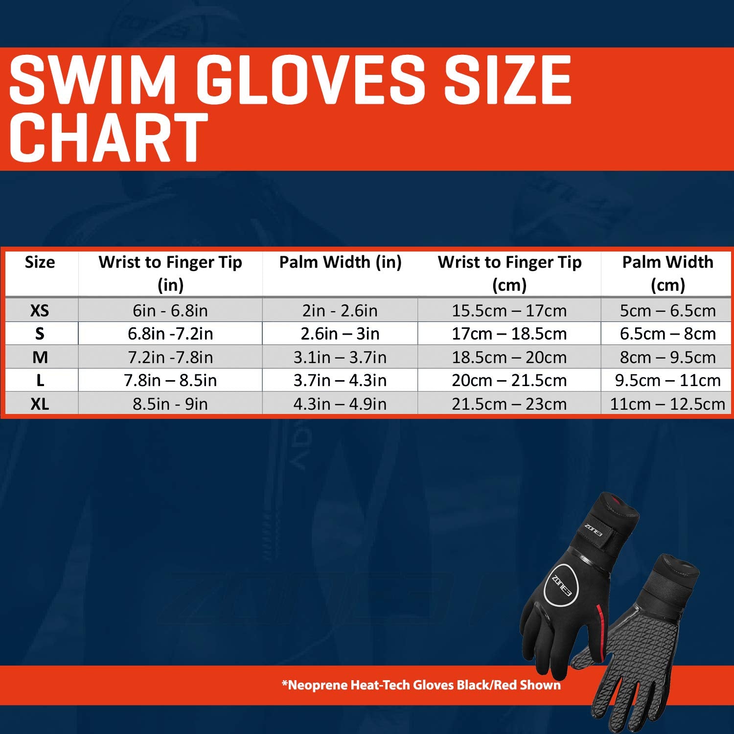 These innovative swim gloves are some of the warmest available on the market, perfect for those who suffer from cold hands or swim through the spring, autumn or winter. They are 3.5mm thick, slightly thicker than Zone3's standard gloves and come complete with a Titanium lining to reflect the body's heat and improve warmth. They are made from high-stretch material to ensure a great fit and flexibility during the swim. The seams are glued, double blind stitched and then liquid sealed on the external side to help ensure they are watertight and durable. External Seams with Liquid Seal Finish: Watertight, comfortable and durable. 3D Palm Pattern Grip. Sizing Base of Palm to Tip of Fingers in Inches: Small (Less than 7), Medium (7-8), Large (Greater than 8)