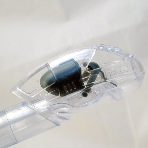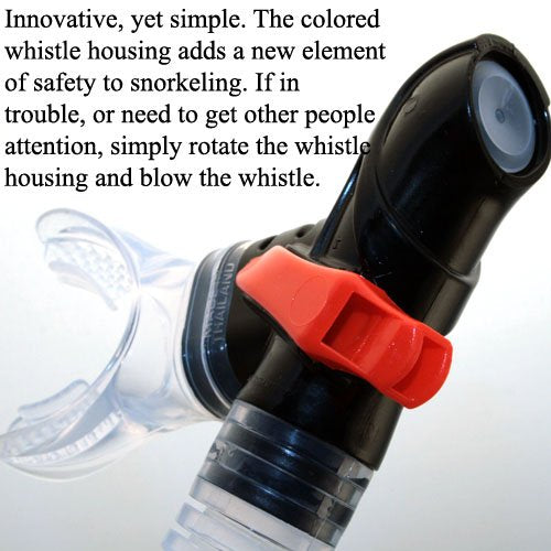 A 100% Submersible dry snorkel features upper Valve and Hinged seal keeps water from entering the snorkel as in submerge; but allows air to easily ENTER snorkel for clean and unobstructed breathing as on surface. Specially designed cover guards against water splashing into the snorkel. Slip-in snorkel keeper with quick release Retainer. Flexible Silicone corrugated low section bends easily. Colored whistle housing to get attention. Pre-curved Silicone mouthpiece, prevents jaw fatigue. Silicone one way purge Valve not only keep water out from snorkel but for easy draining.