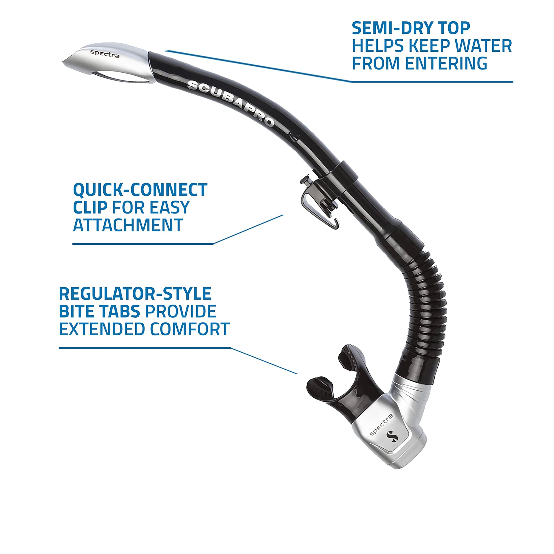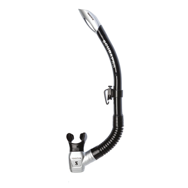 This snorkel is tops when it comes to breathing comfort and ease of clearing. The large-bore upper tube is rigid for stability and allows plenty of airflow, while the corrugated lower tube can be easily positioned when being used, and hangs out of the way when not being used. The semi-dry top helps prevent water from entering, the purge valve positioned at the lowest point makes quick work of any water that does sneak in.