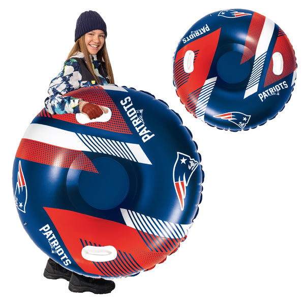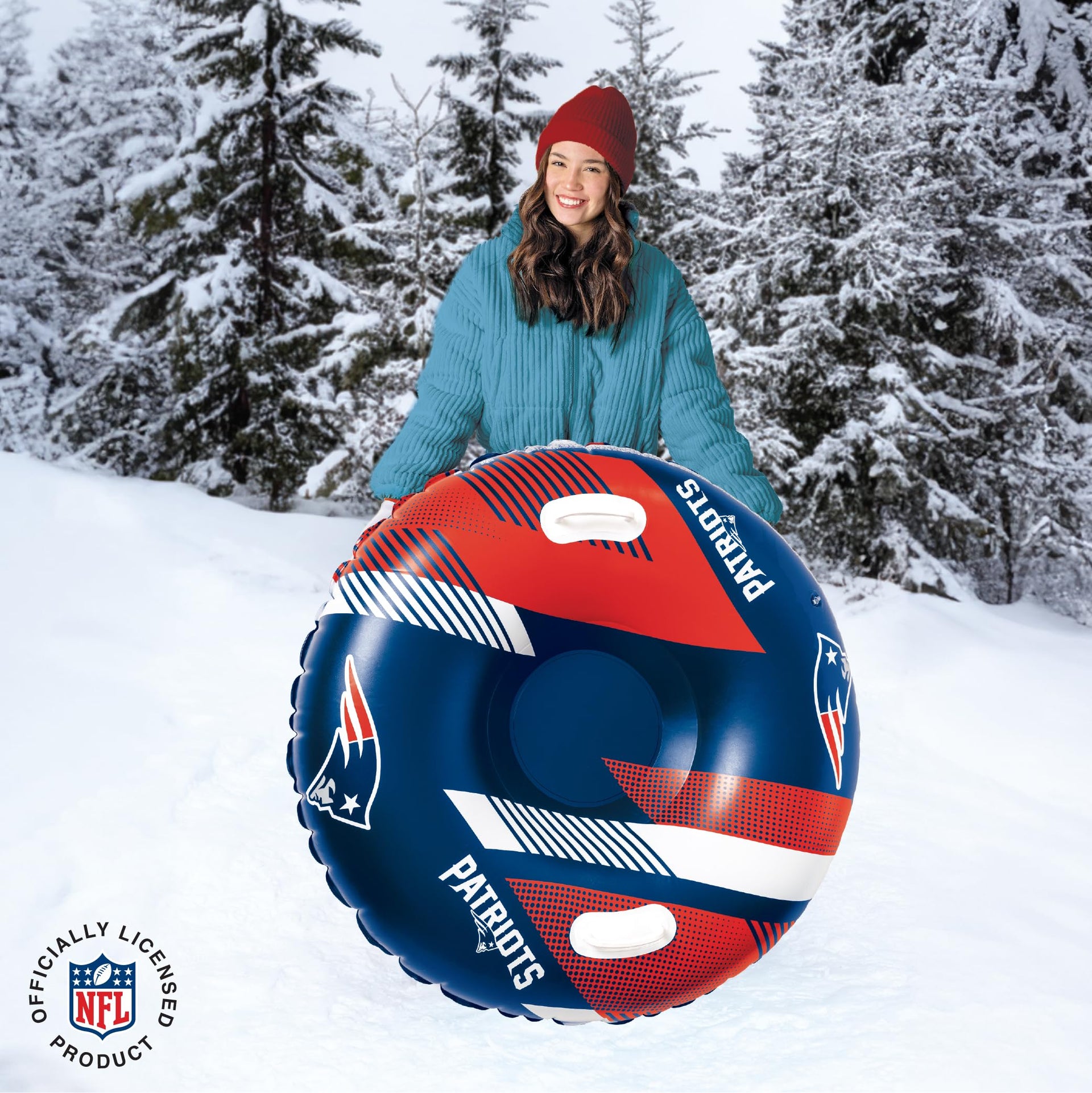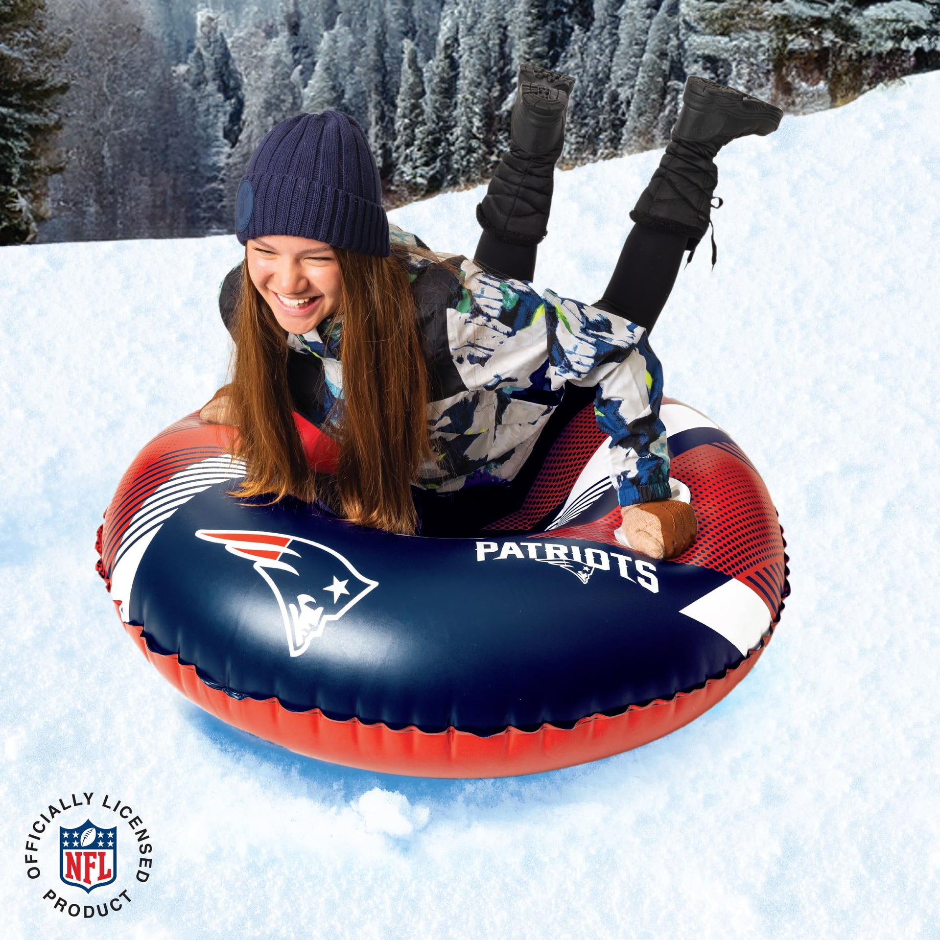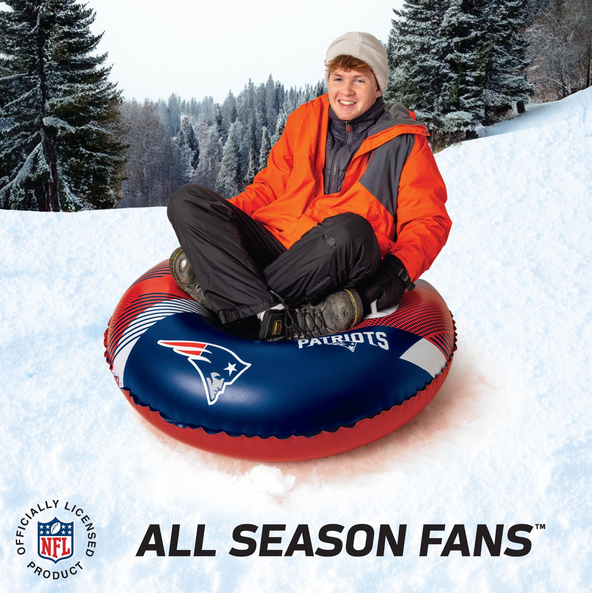 Running Back Rush: Dash down the mountain like a running back! Enjoy this fun winter activity while sporting your love for football. | Durable Material: These snow tubes are made from heavy-duty PVC to prevent cracking or damage in freezing conditions. These tubes are resistant to cold temperatures and can withstand terrain. | Comfortable Seating: These snow tubes include an ergonomic seating area to keep riders cozy during long tubing rides down the hill. Includes handles for added safety. Over 3ft wide. | Quick-Inflate Valve: Easy-to-use valve for rapid inflation and deflation. Easy to pack up and store during the off-season. Easily transition from watching sports to sledding down the slopes. | Licensed NFL Product: Show your love for your favorite football team, the New England Patriots! Rule the slopes with our MVP-worthy snow tubes. This makes a fun gift for football fans.