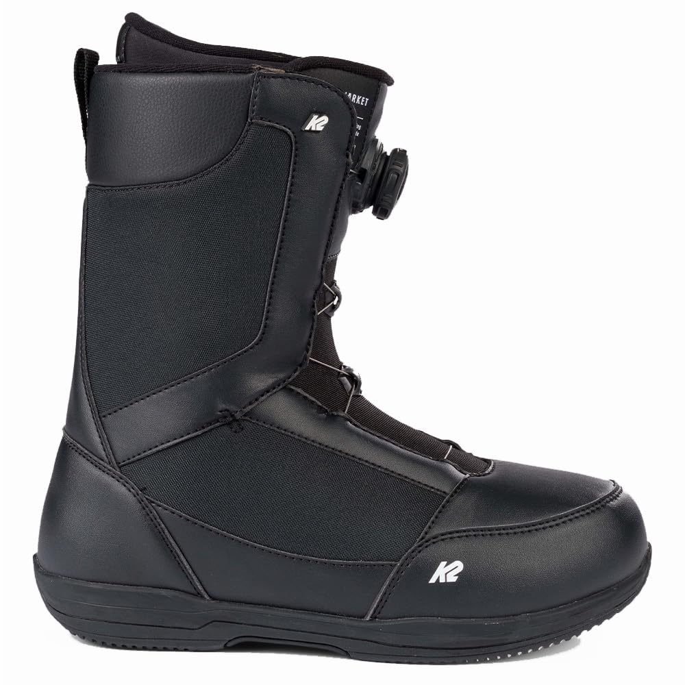 Take the next step in your development with the K2 Market boot, engineered for all-day warmth, comfort, and performance-enhancement. The proven M1 Coiler BOA Fit System lacing interface uses stainless steel BOA laces to tighten the outer shell and allow quick on and offs in the parking lot. This lacing system works in harmony with an articulating cuff, ensuring that the boot delivers a smooth flex that simply makes turning easier. The Fast-In liner lacing system hugs the liner to your lower leg and foot, and the Comfort Foam EVA liner will quickly form to the individual shape of your feet. The liner in the K2 Market snowboard boot also features internal J-bars, designed to hug and support your ankles to up the personalized fit. The icing on the cake is our Low Pro OS outsole, built from a durable and grippy rubber compound that will keep you upright while walking across frozen parking lots or hiking your first line. Thoughtfully designed, the Market boot is designed to help you take the next step on the mountain. KEY FEATURES. M1 BOA Fit System. Flex Zone Upper. Comfort Foam EVA Liner. Fast-In Liner Lacing System. Harshmellow Footbed. Rubber Light Outsole