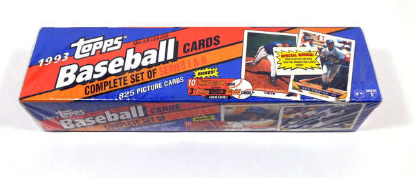 The 1993 Topps Baseball Set Consists Of Two Series, Respectively, Of 396 And 429 Standard-Size Cards. A Topps Gold Card Was Inserted In Every 15-Card Pack. In Addition, Hobby And Retail Factory Sets Were Produced. The Fronts Feature Color Action Player Photos With White Borders. The PlayerS Name Appears In A Stripe At The Bottom Of The Picture, And This Stripe And Two Short Diagonal Stripes At The Bottom Corners Of The Picture Are Team Color-Coded. The Backs Are Colorful And Carry A Color Head Shot, Biography, Complete Statistical Information, With A Career Highlight If Space Permitted. Cards 401-411 Comprise An All-Star Subset. Rookie Cards In This Set Include Jim Edmonds, Derek Jeter And Jason Kendall.