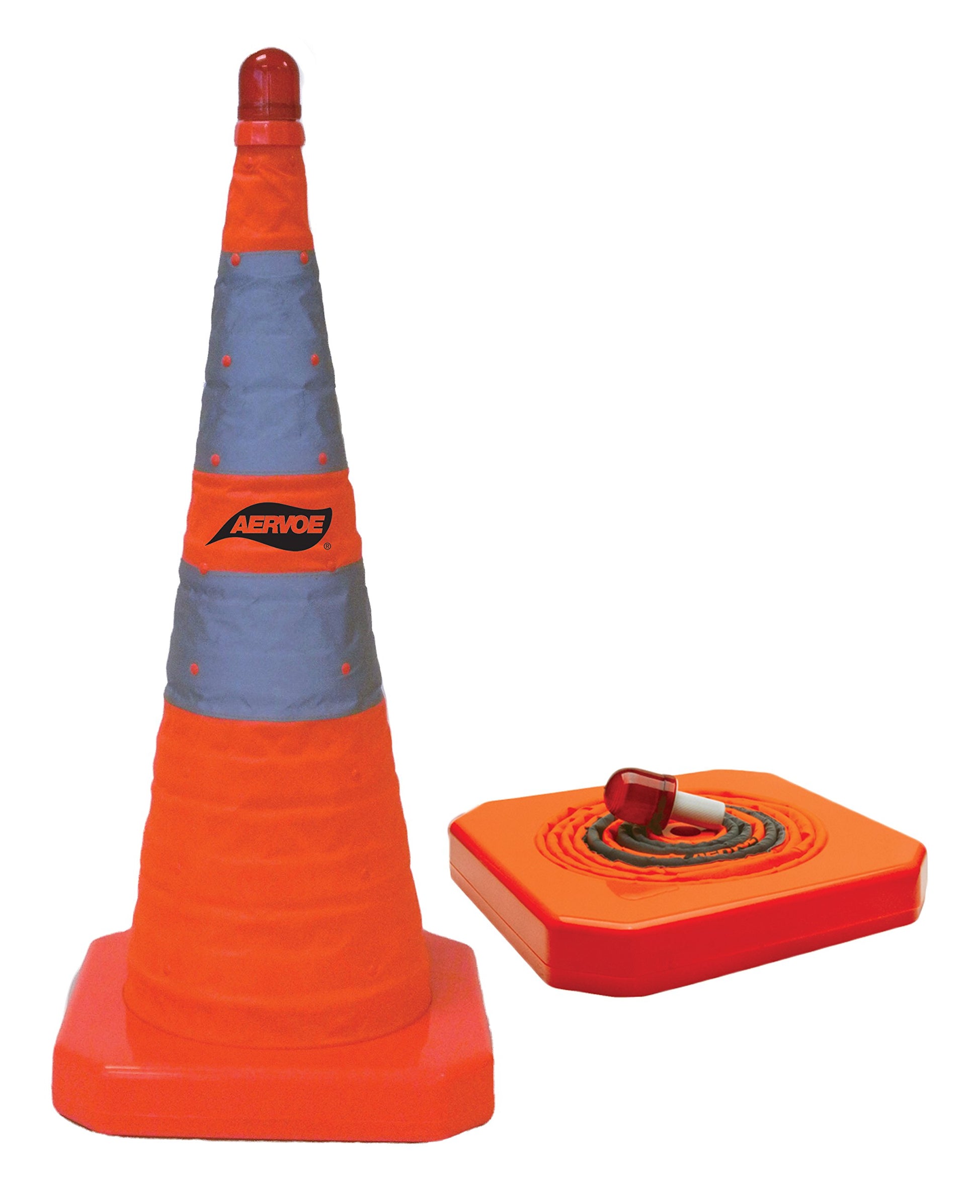 The Aervoe 28'' Safety Cone is collapse for storage. Made of durable nylon with two refective stripes, blinking LED Beacon & storage case for compact storage in car, truck or tool box. This product is ideal for first responders, personal automotive safety, contractors & road maintenace crews.