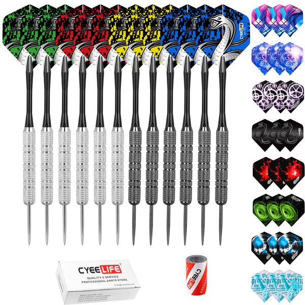 - Q: What is included in the CyeeLife Steel Tip Darts set? A: The CyeeLife Steel Tip Darts set includes 20g steel tip darts, 36 flights in 12 different designs, and a sharpener.