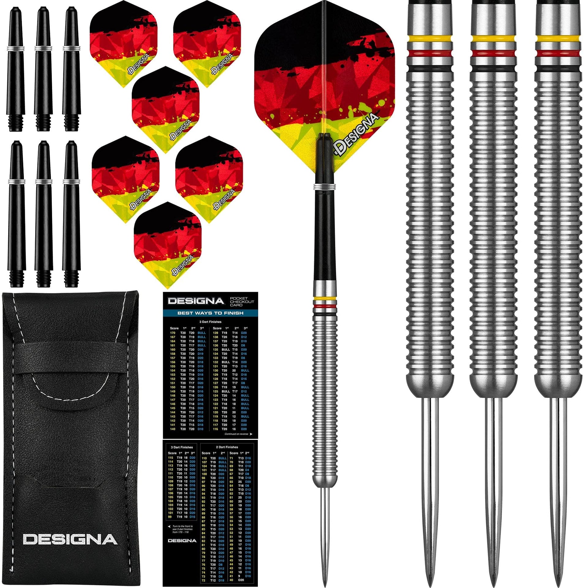 - Q: What accessories are included with the dart set? A: The set comes with a Designa Bar Wallet and a Checkout Chart for convenience.